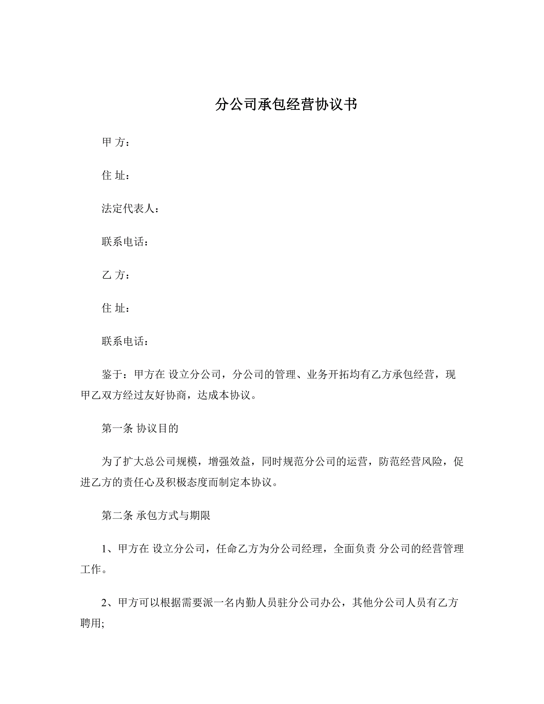 >分公司承包经营协议书