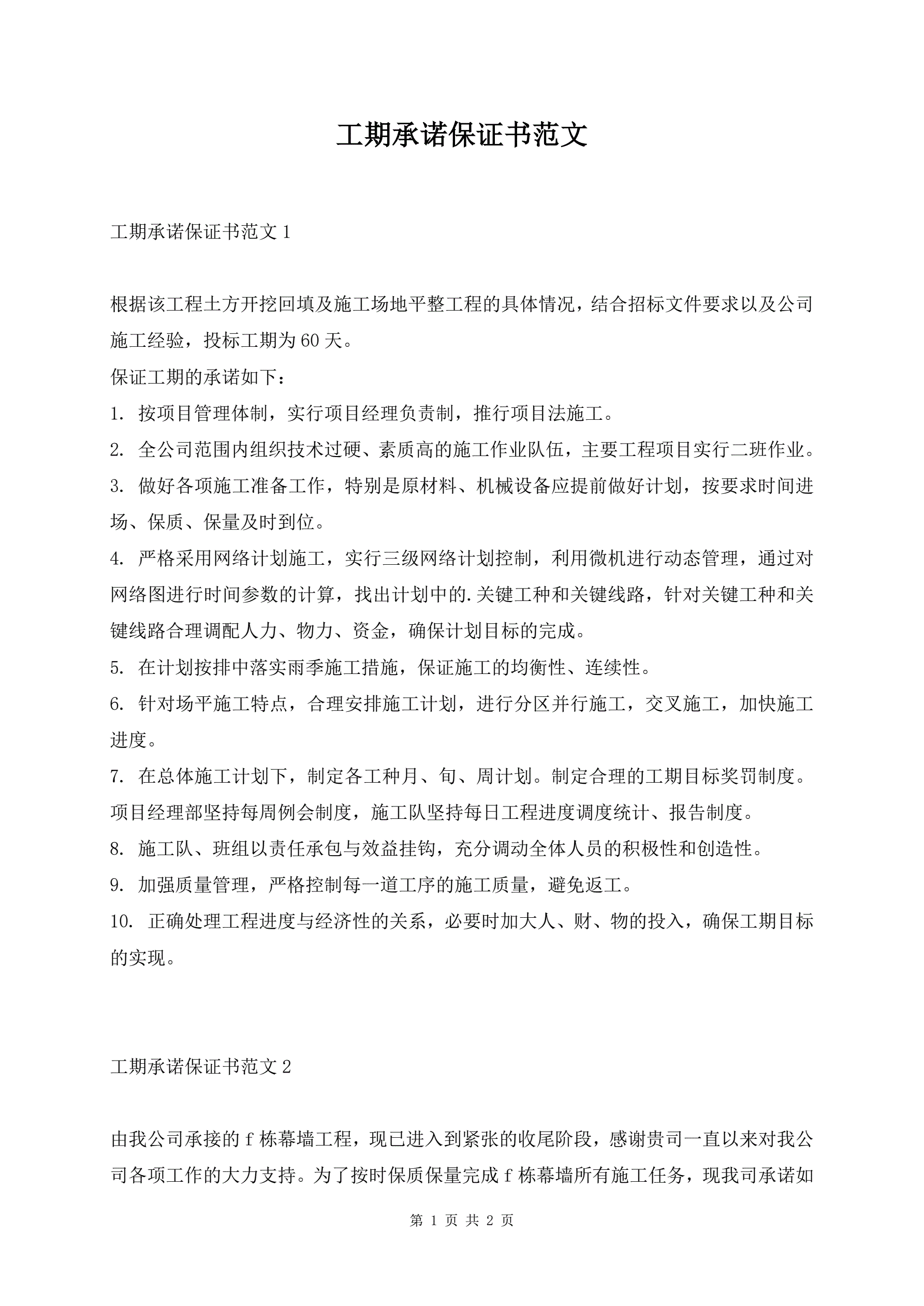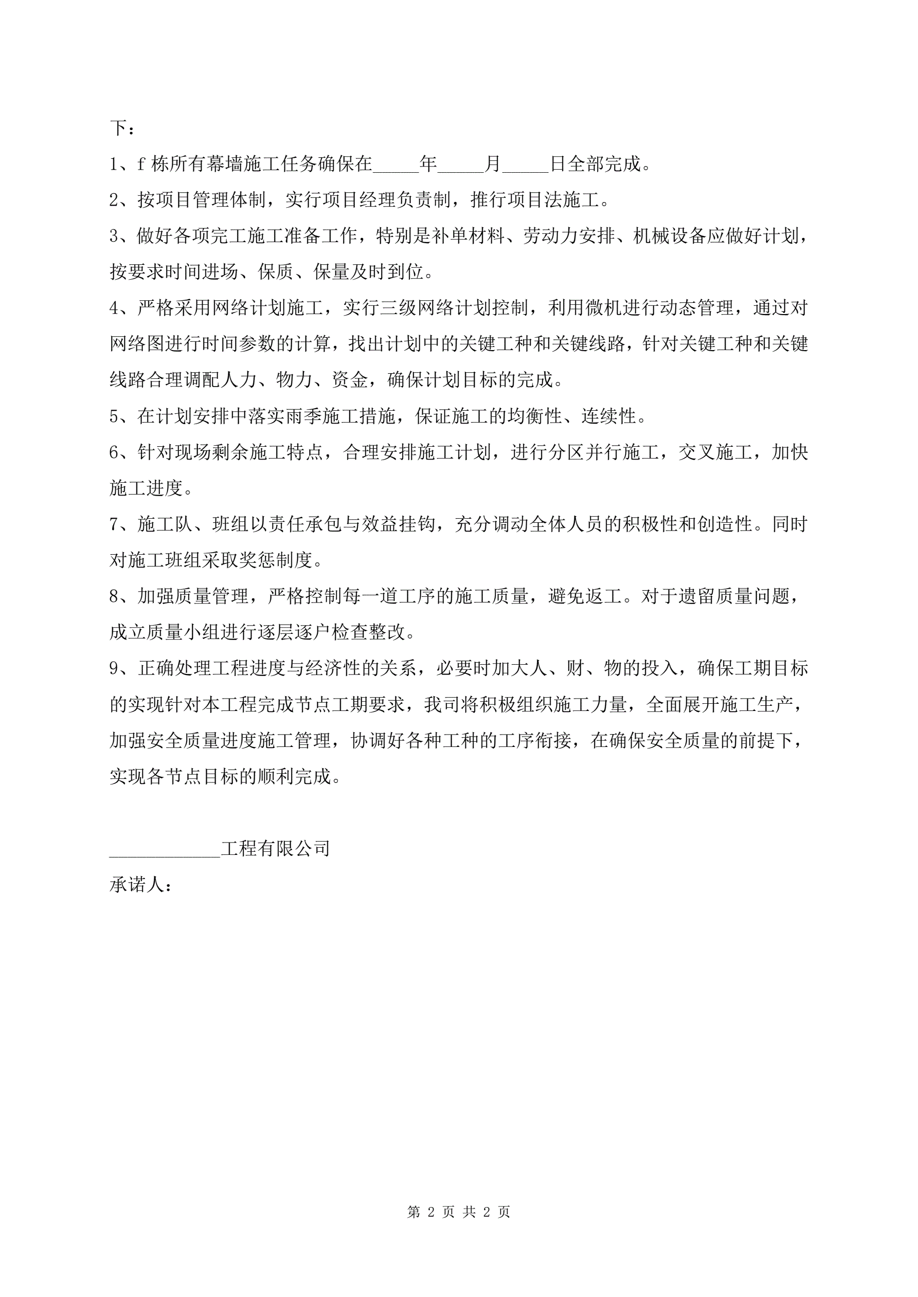 工期承诺保证书范文