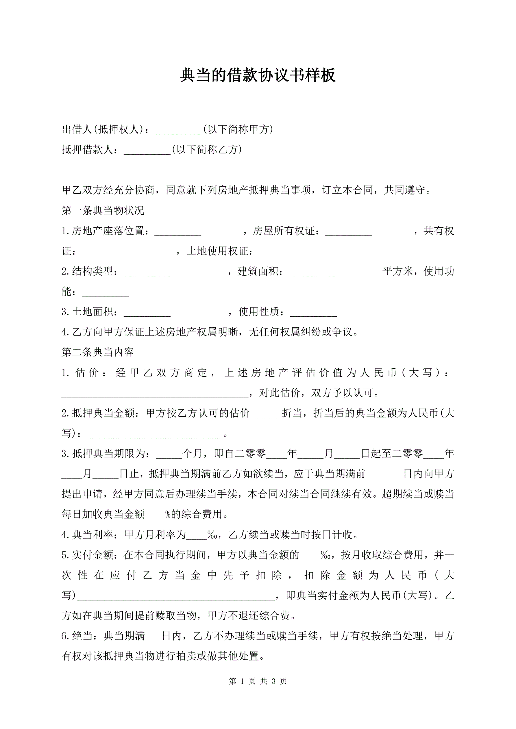 >典当的借款协议书样板