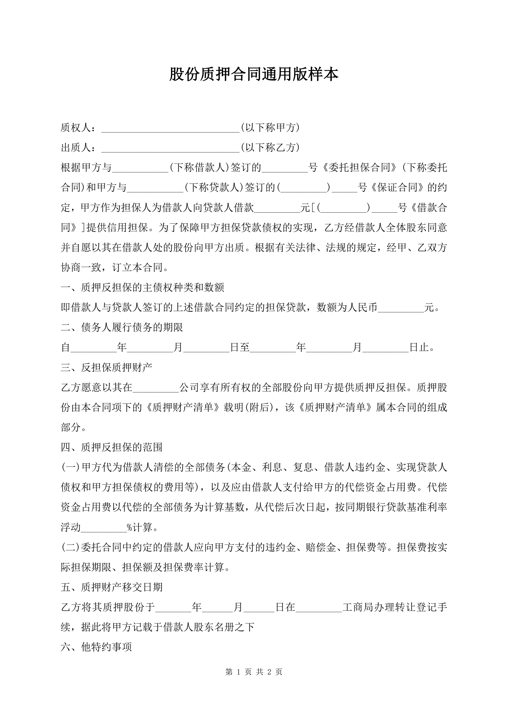股份质押合同通用版样本