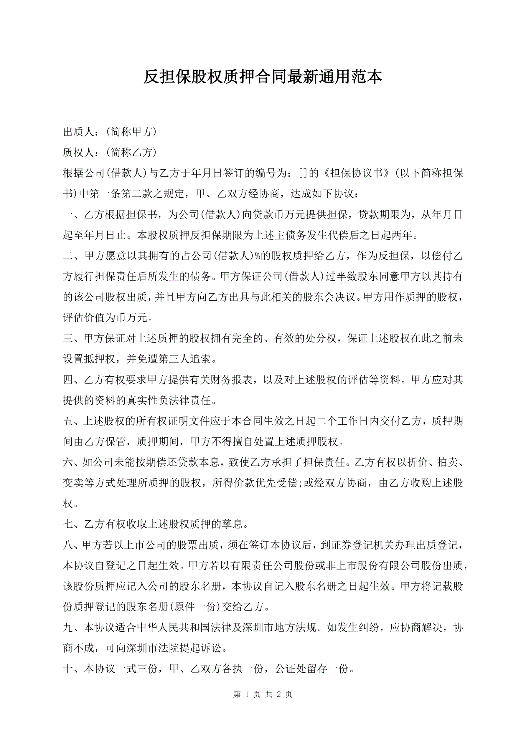 >反担保股权质押合同最新通用范本