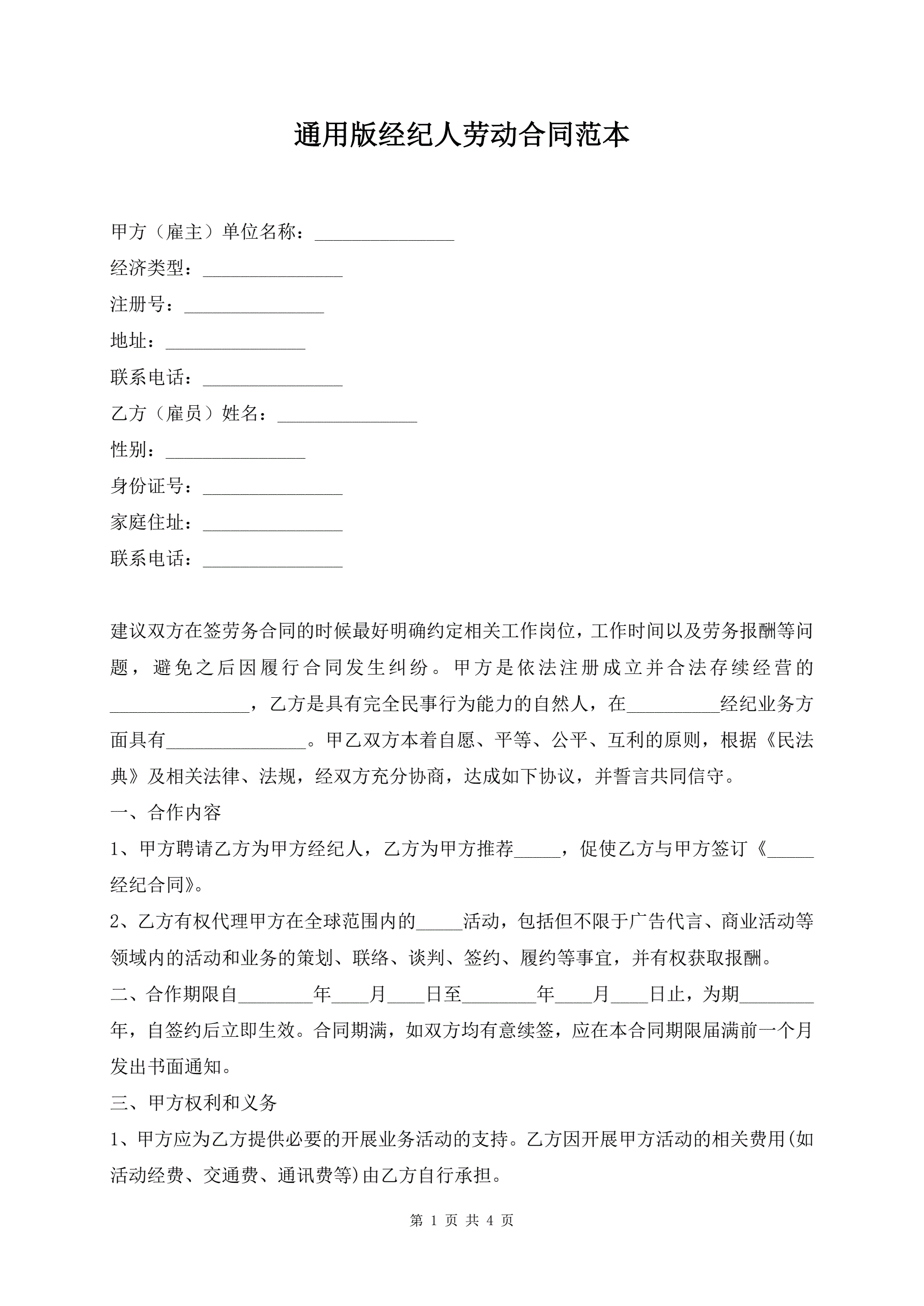 通用版经纪人劳动合同范本