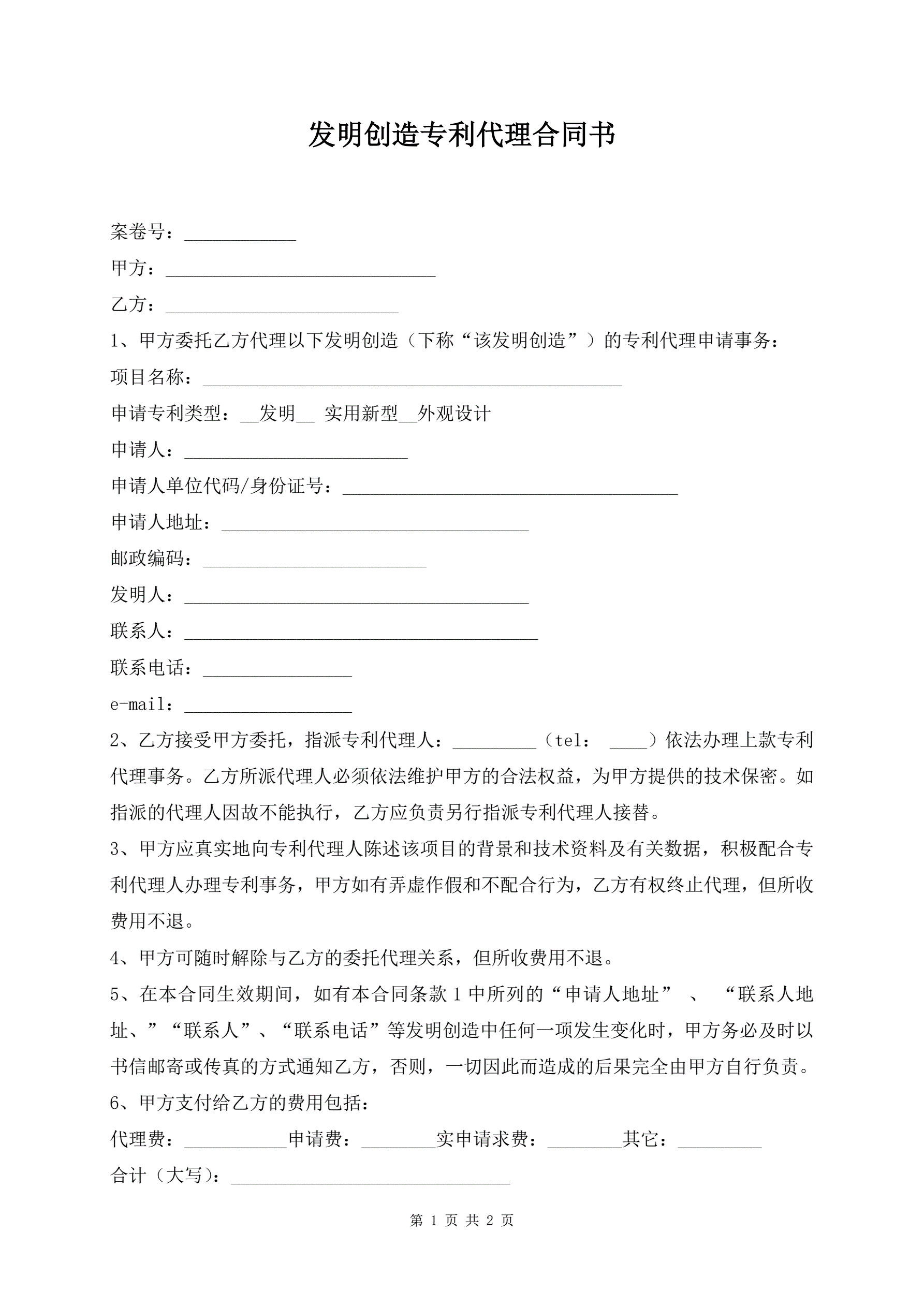发明创造专利代理合同书