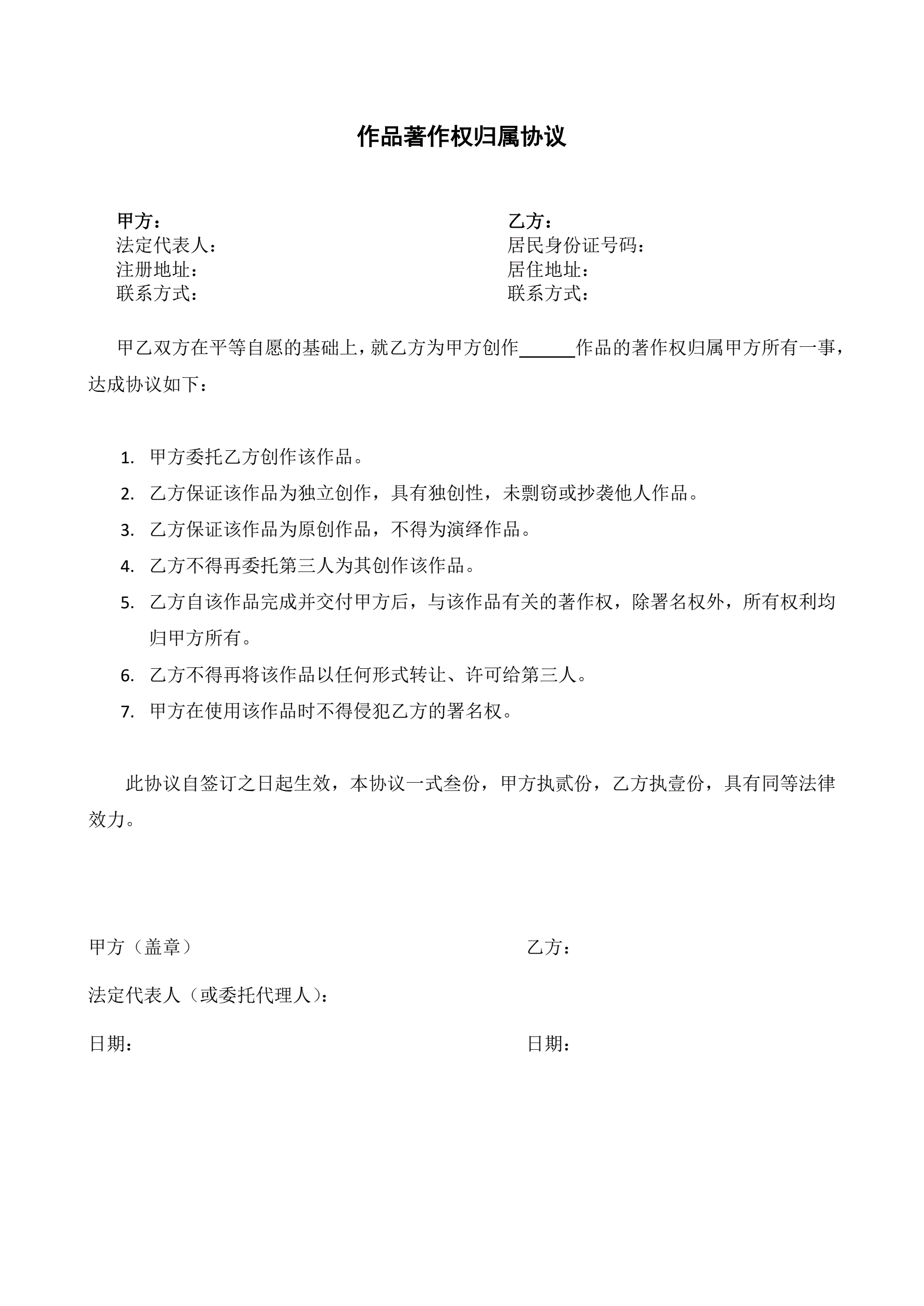 作品著作权归属协议(指导版)