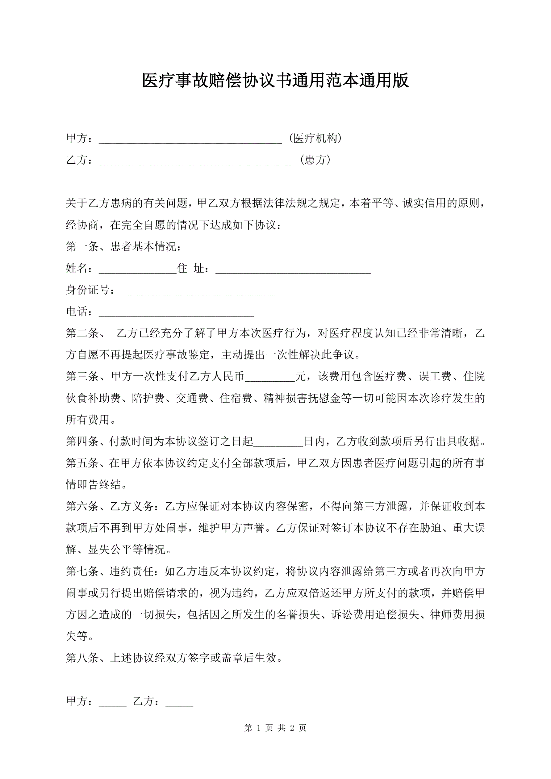 医疗事故赔偿协议书通用范本通用版