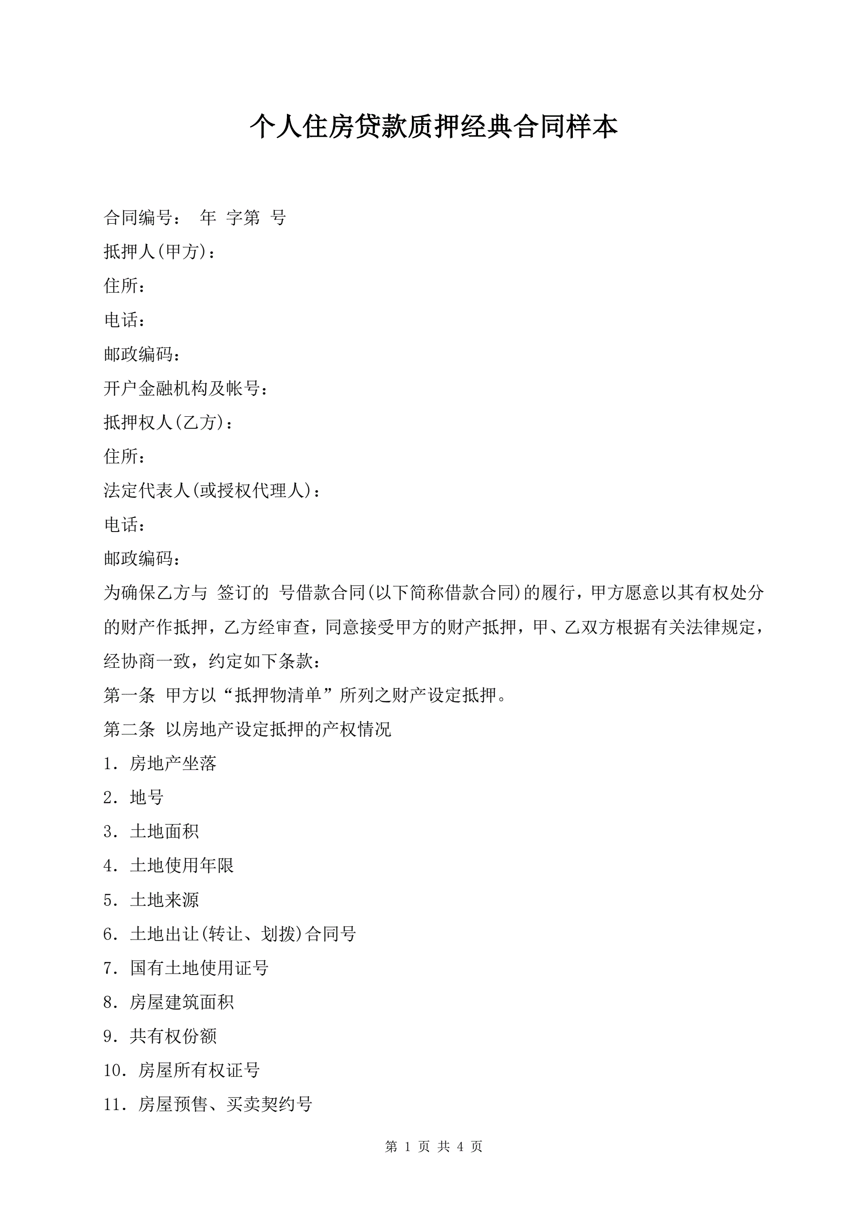 个人住房贷款质押经典合同样本