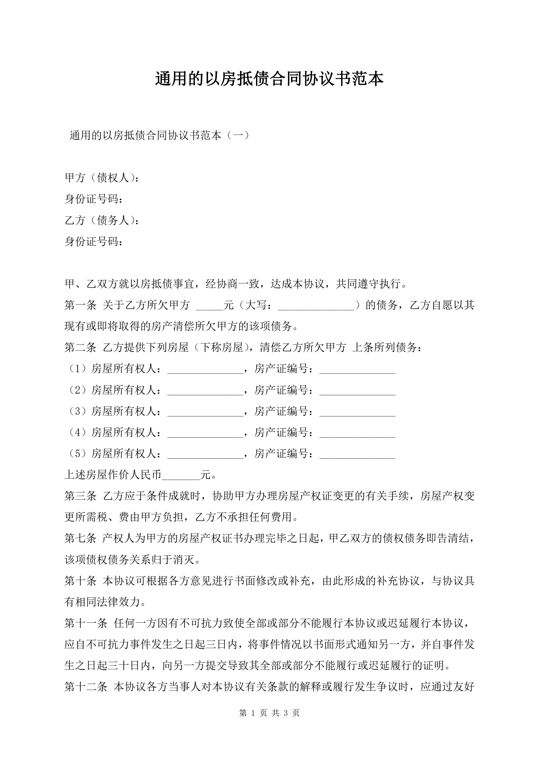 >通用的以房抵债合同协议书范本