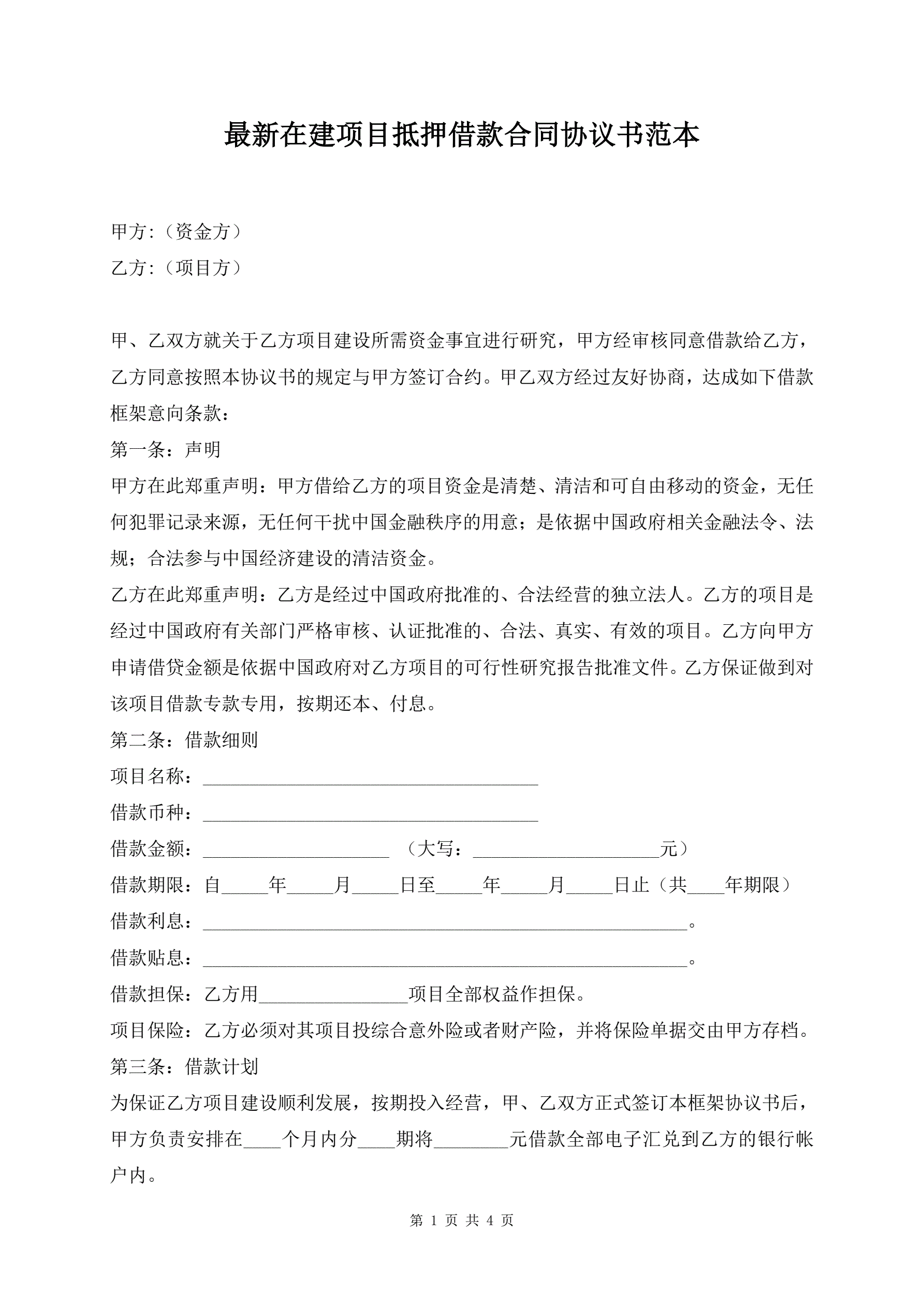 >最新在建项目抵押借款合同协议书范本
