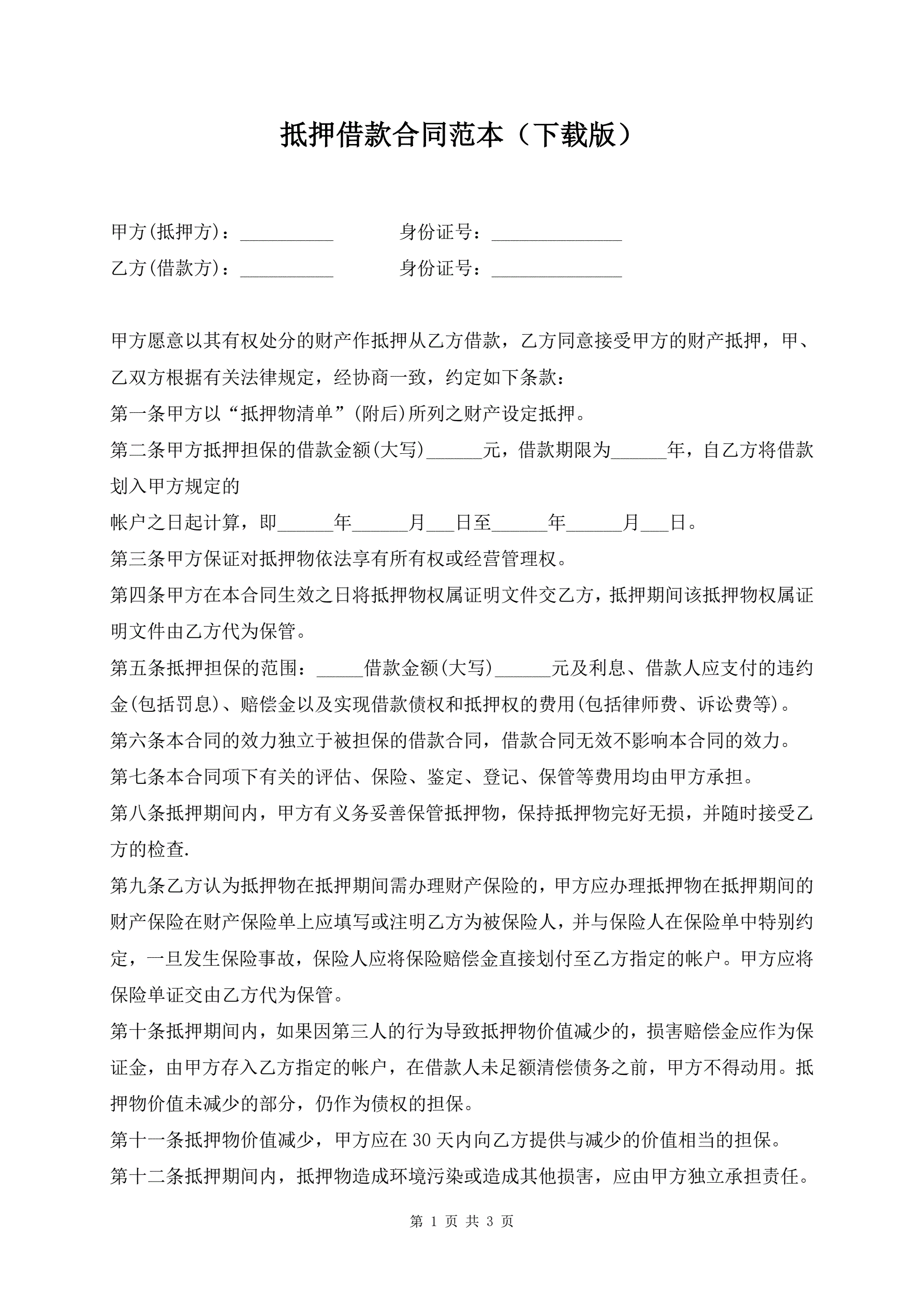 抵押借款合同范本(下载版)