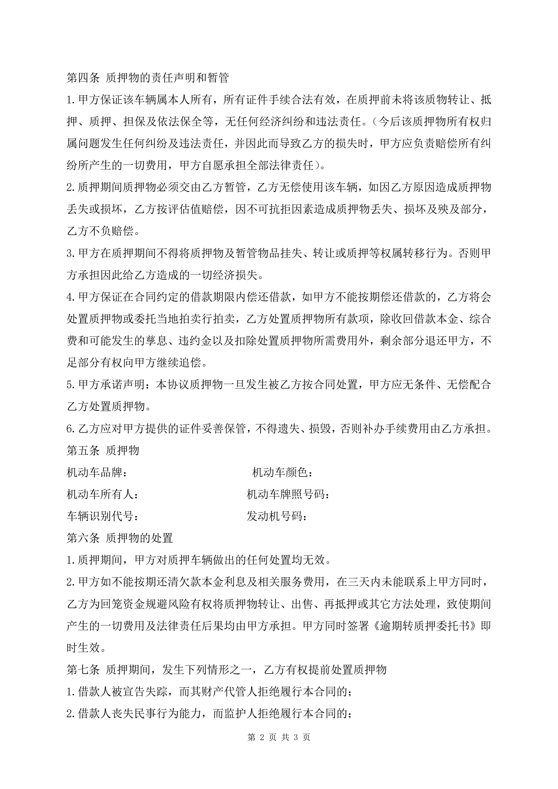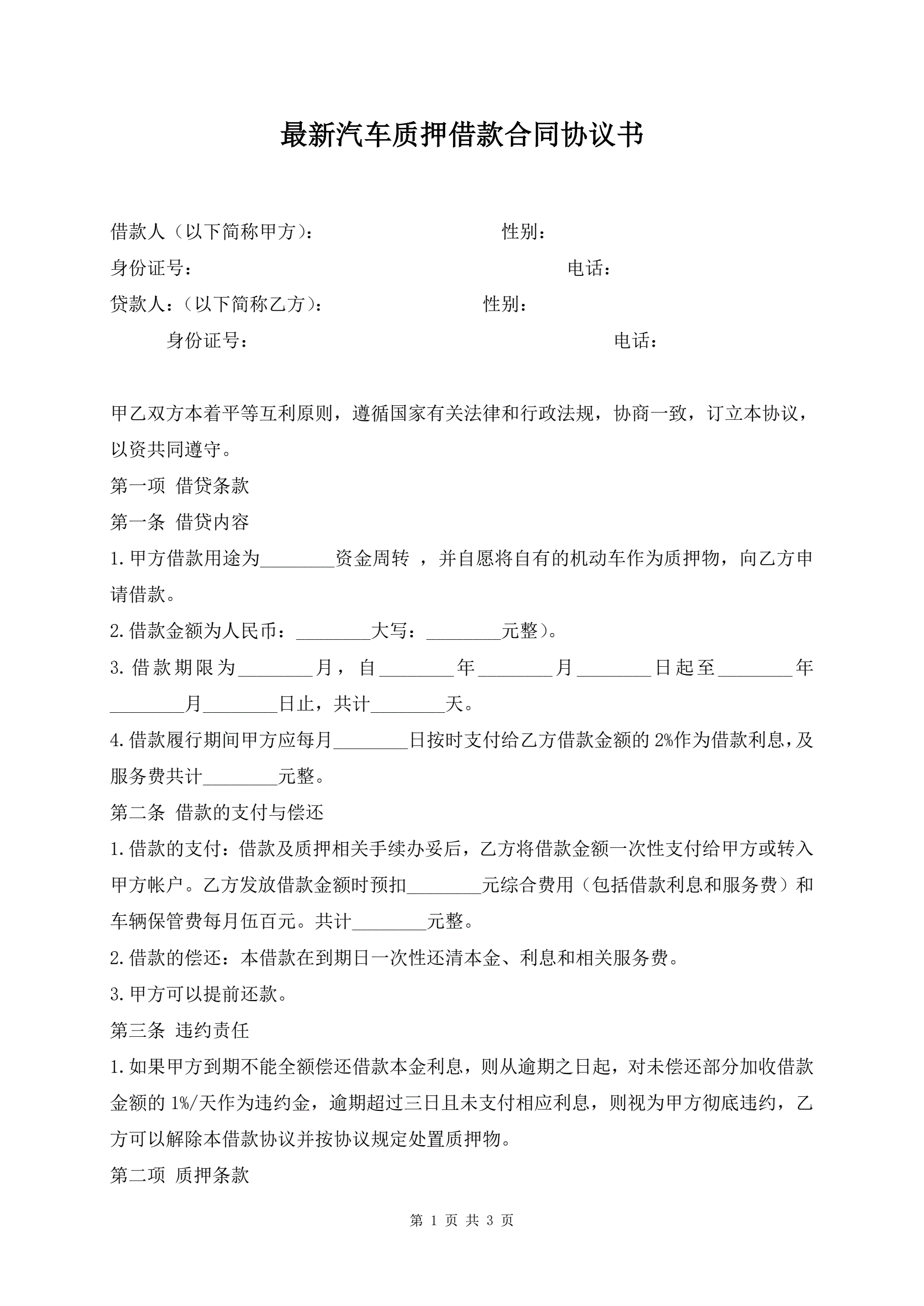 >最新汽车质押借款合同协议书