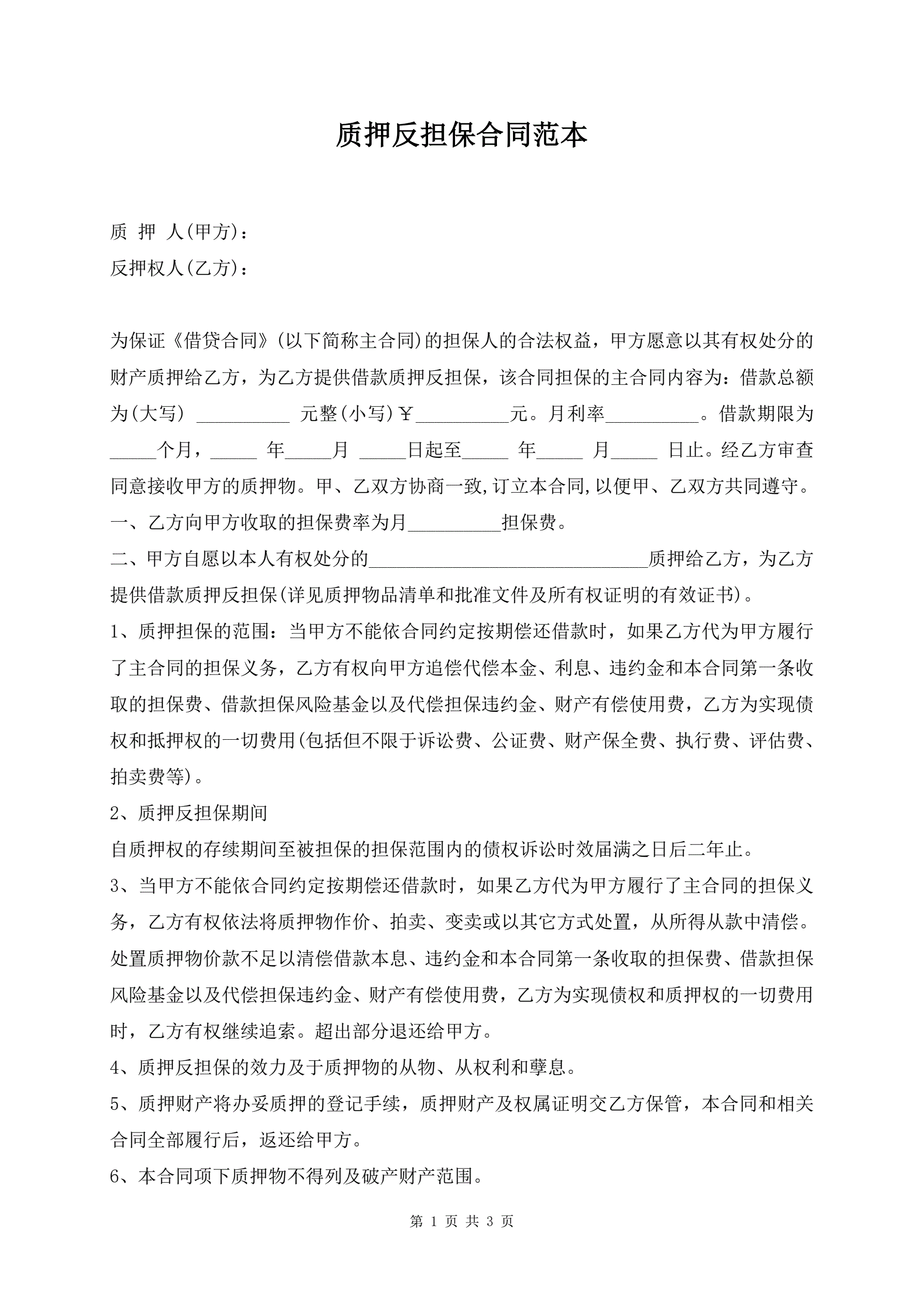 质押反担保合同范本