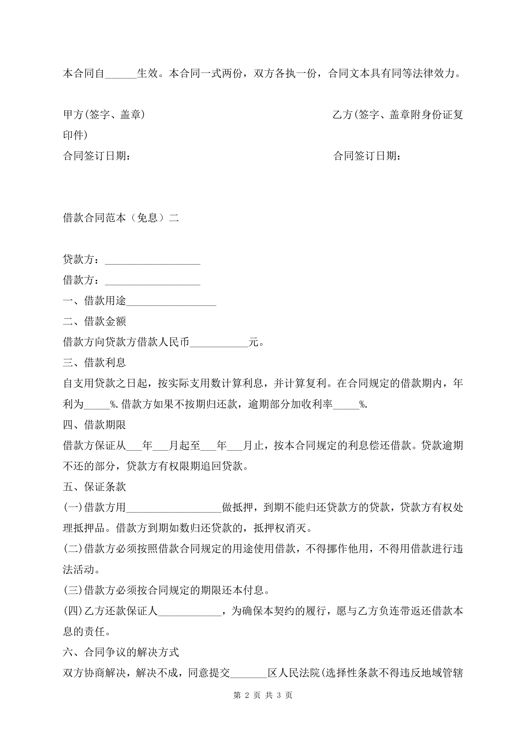 借款合同范本(免息)