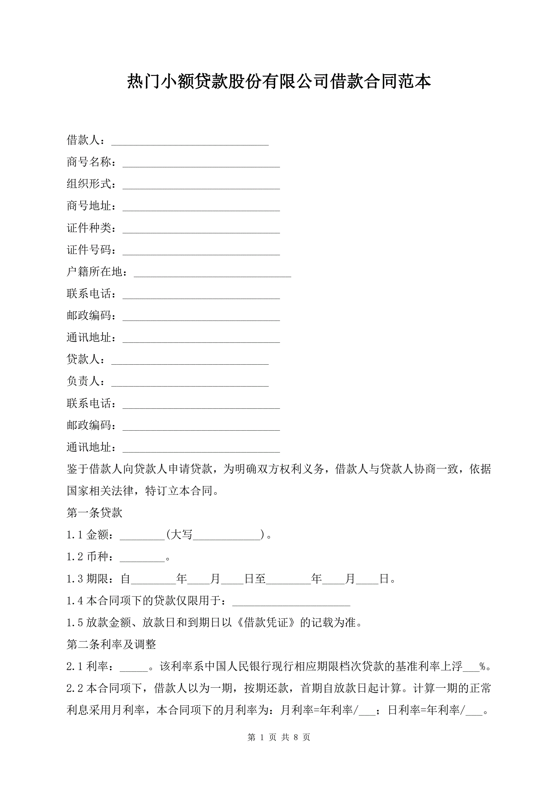 >热门小额贷款股份有限公司借款合同范本