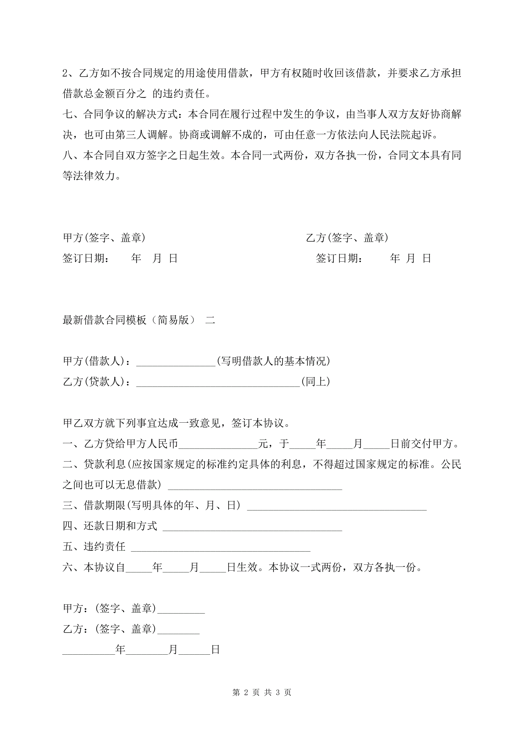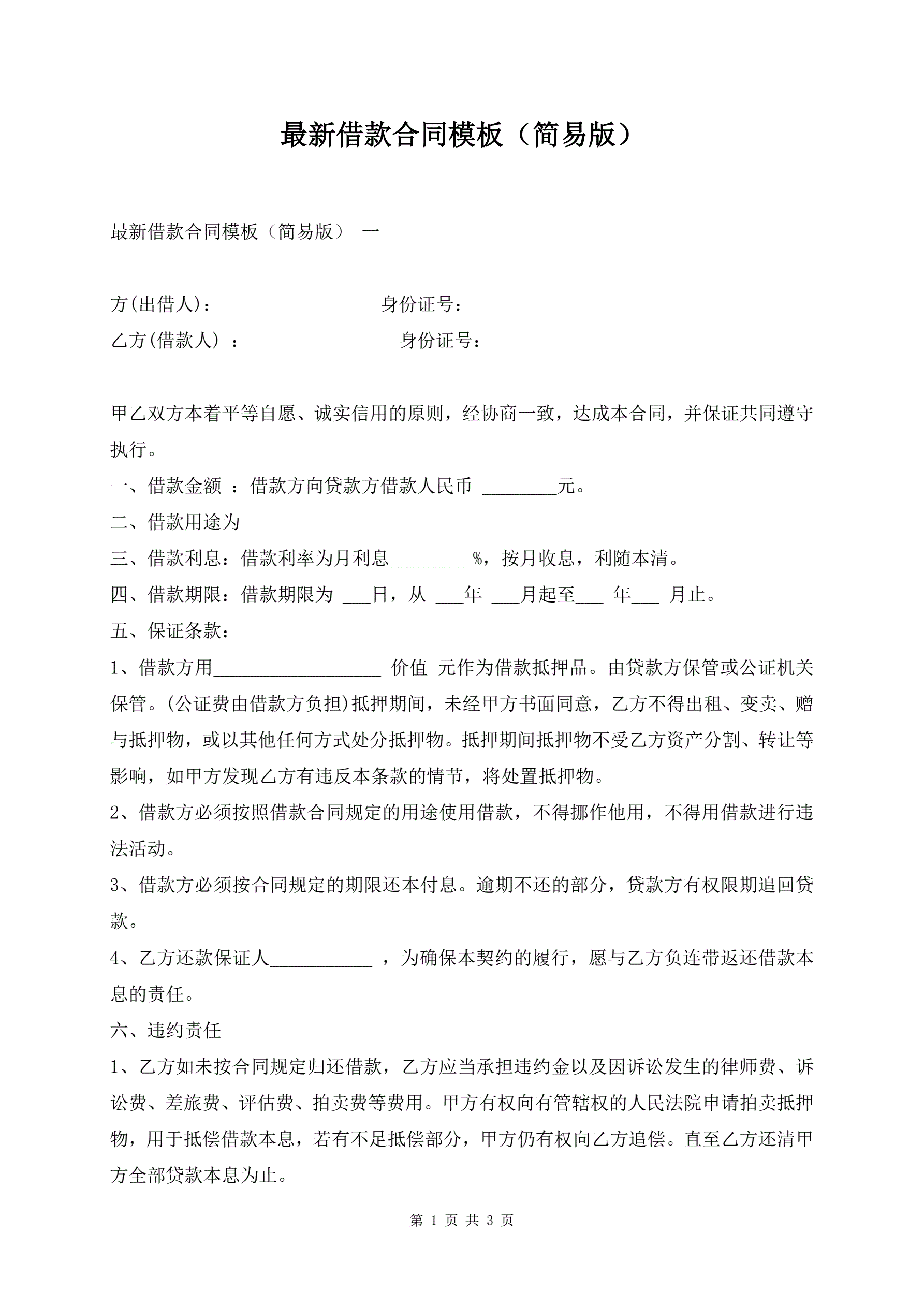 最新借款合同模板(简易版)