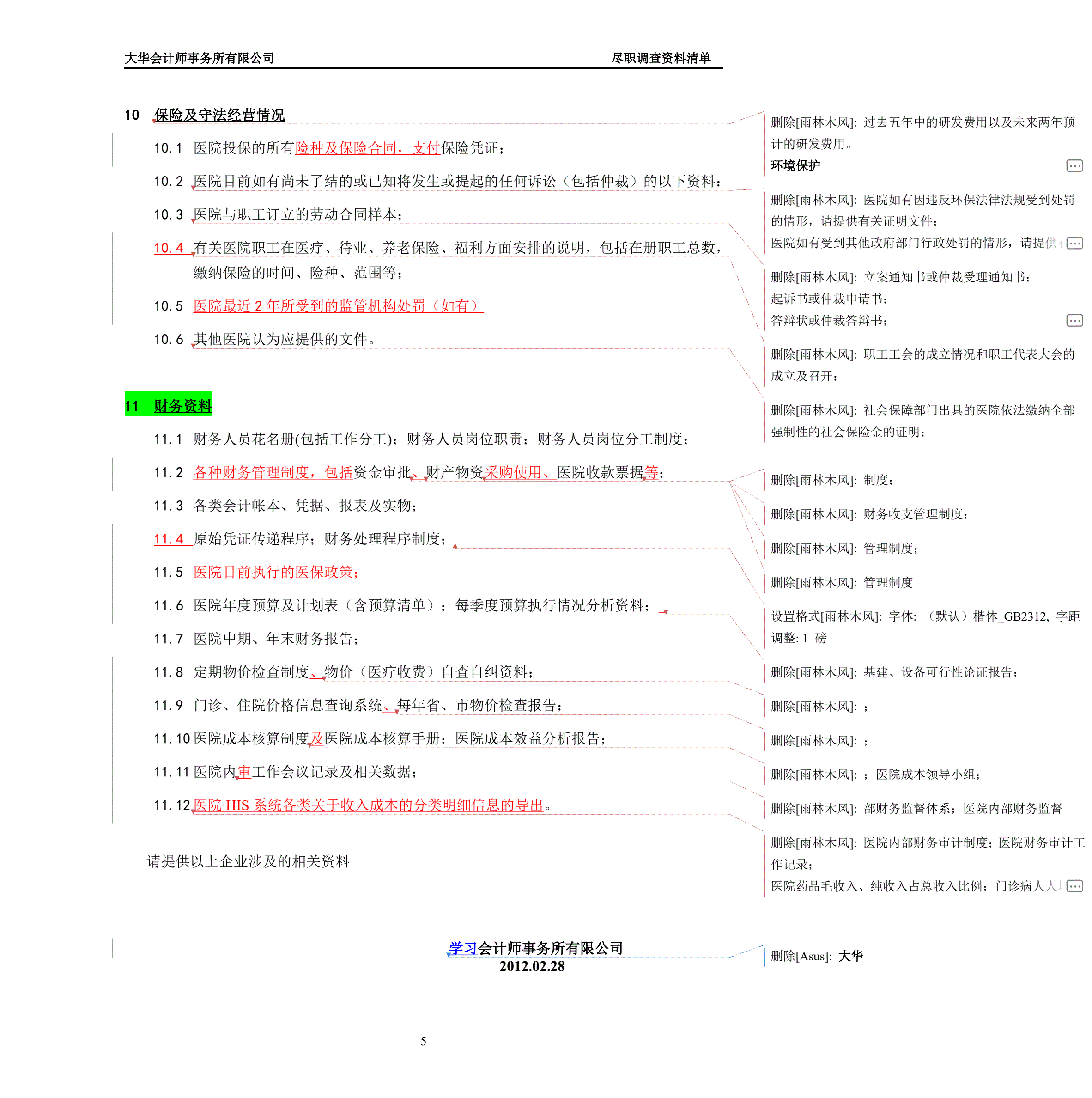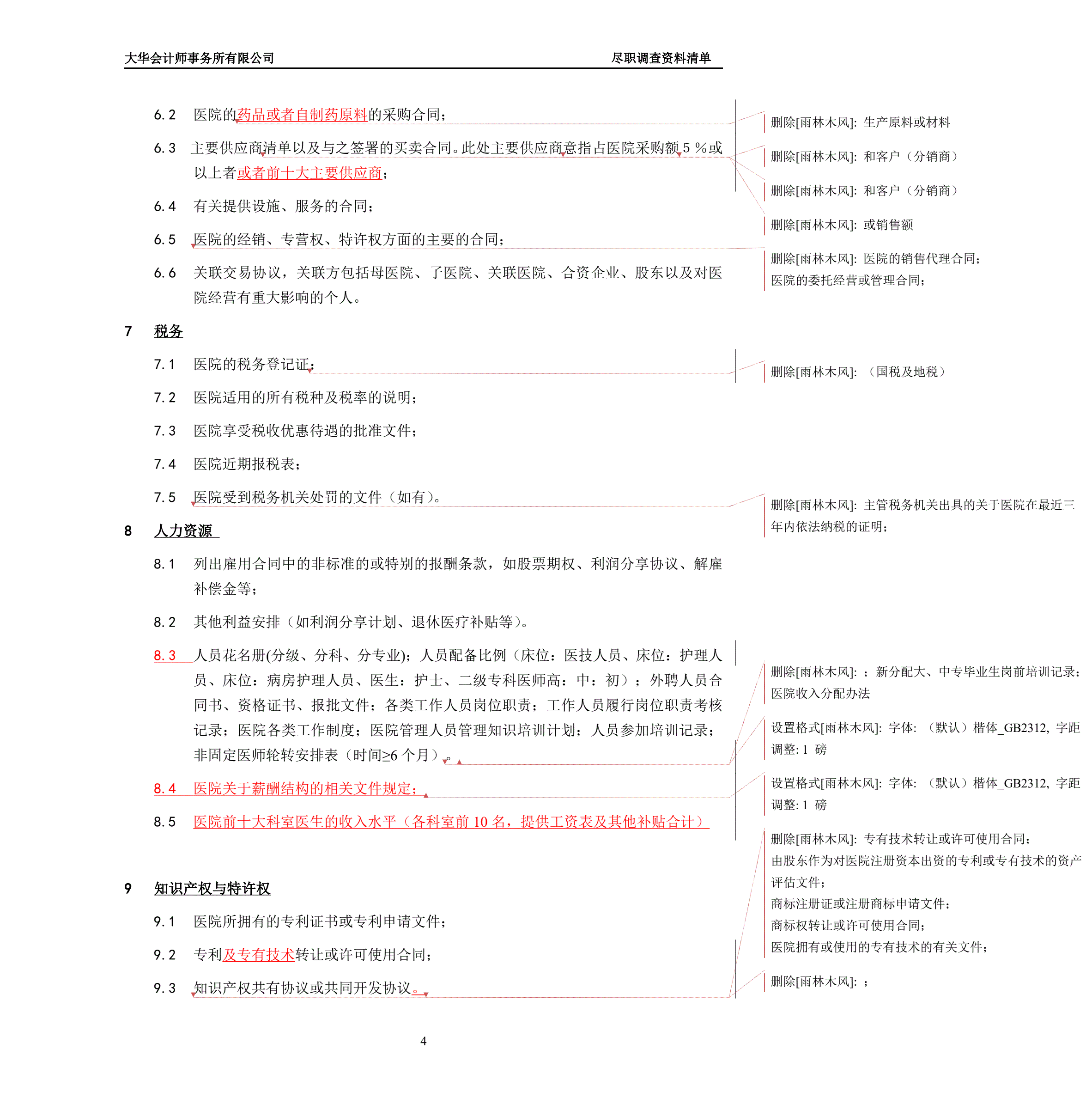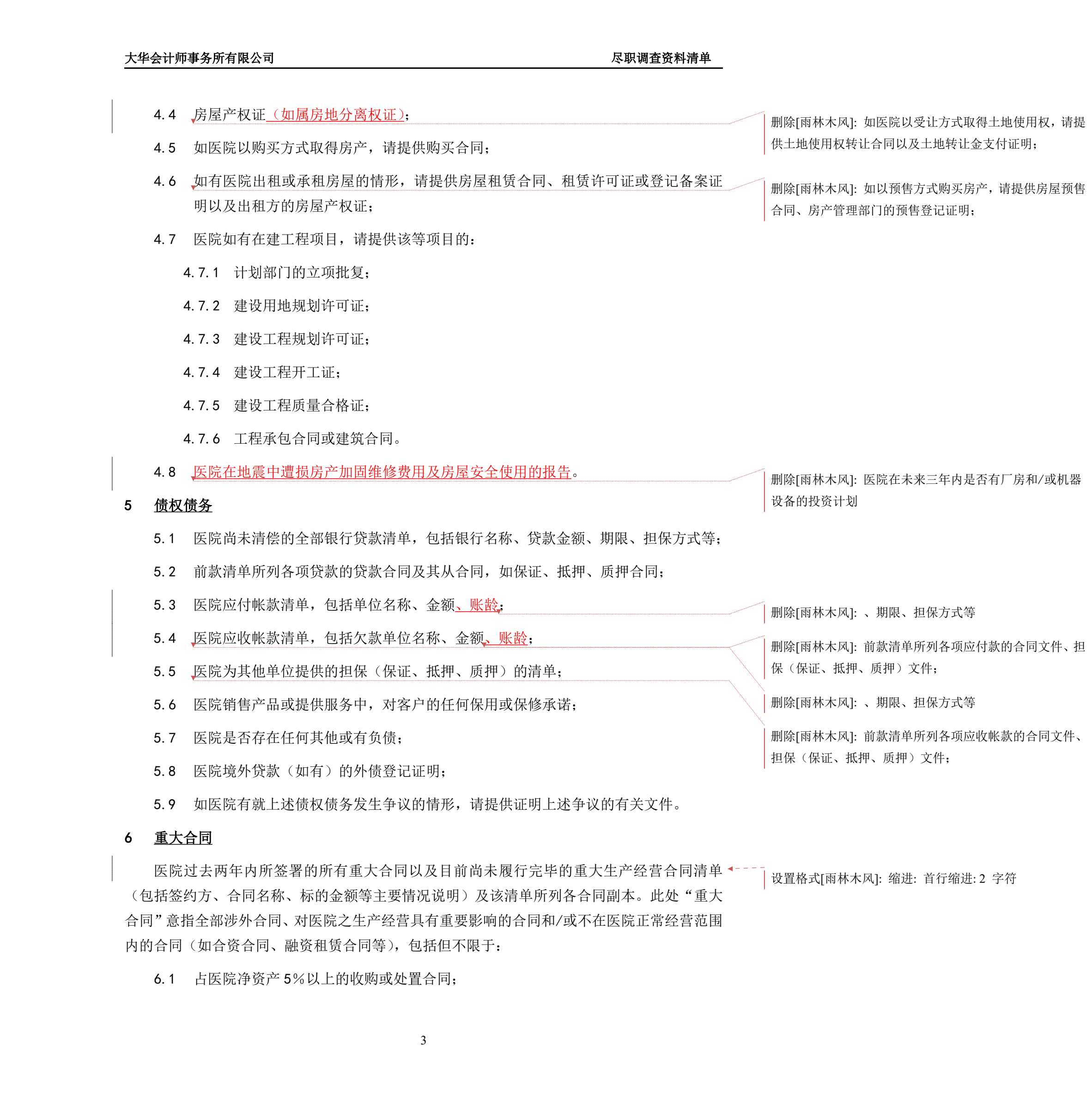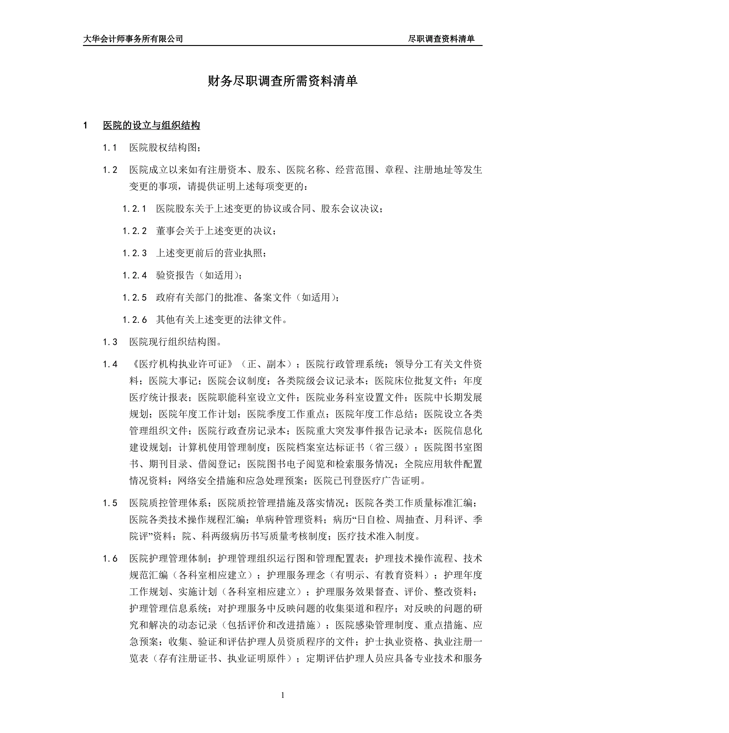 医院尽职调查所需资料清单