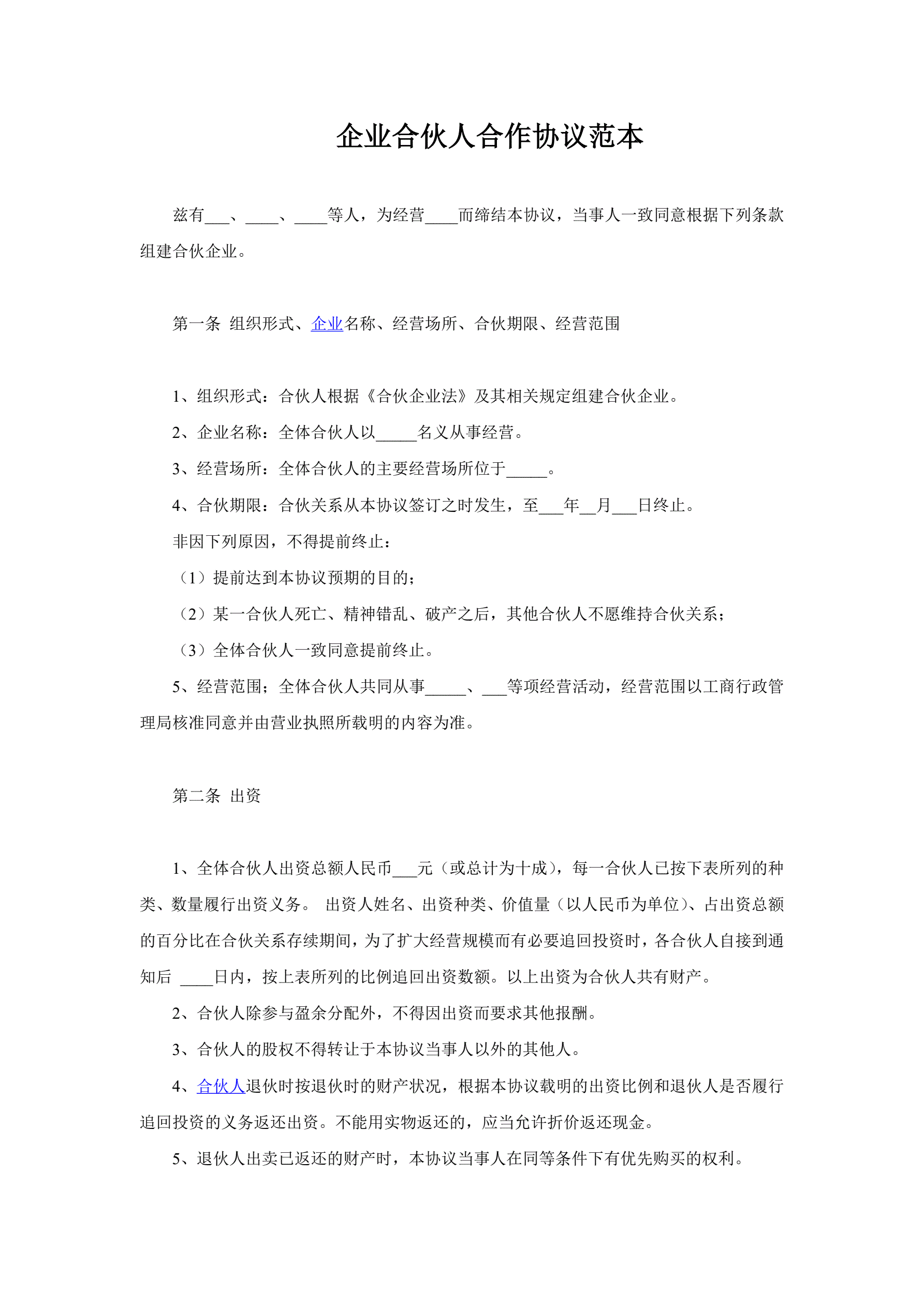 合同名称:企业合伙人合作协议范本