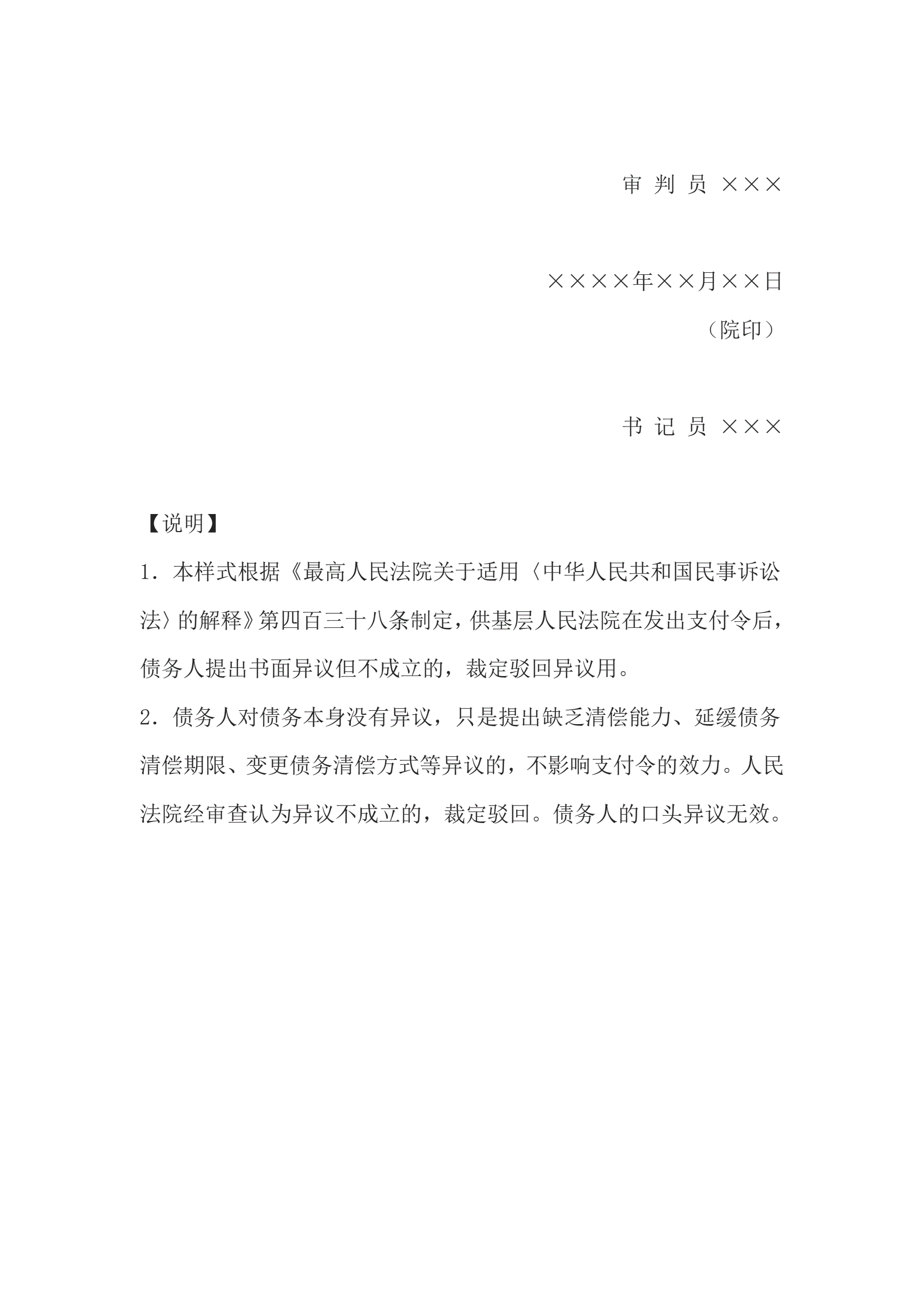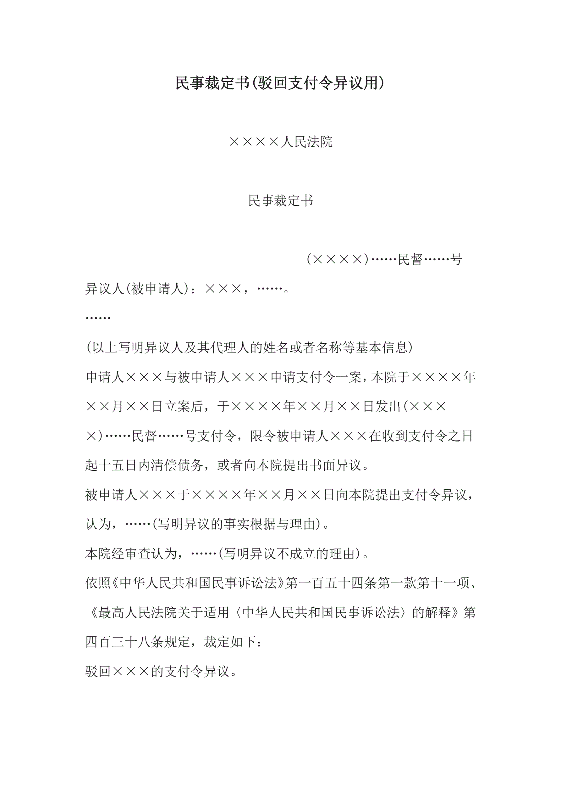 >民事裁定书(驳回支付令异议用)