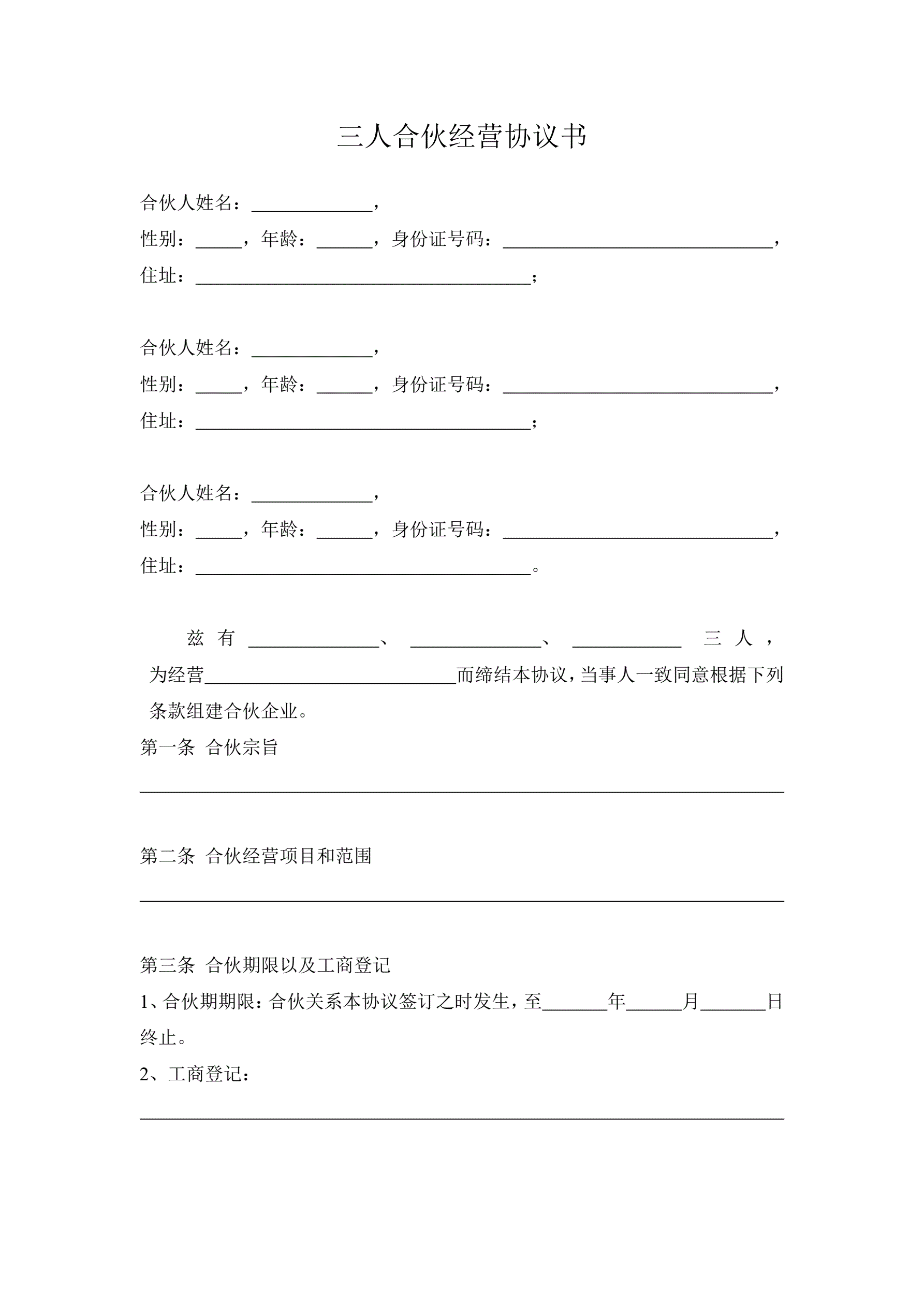 三人合伙经营协议书