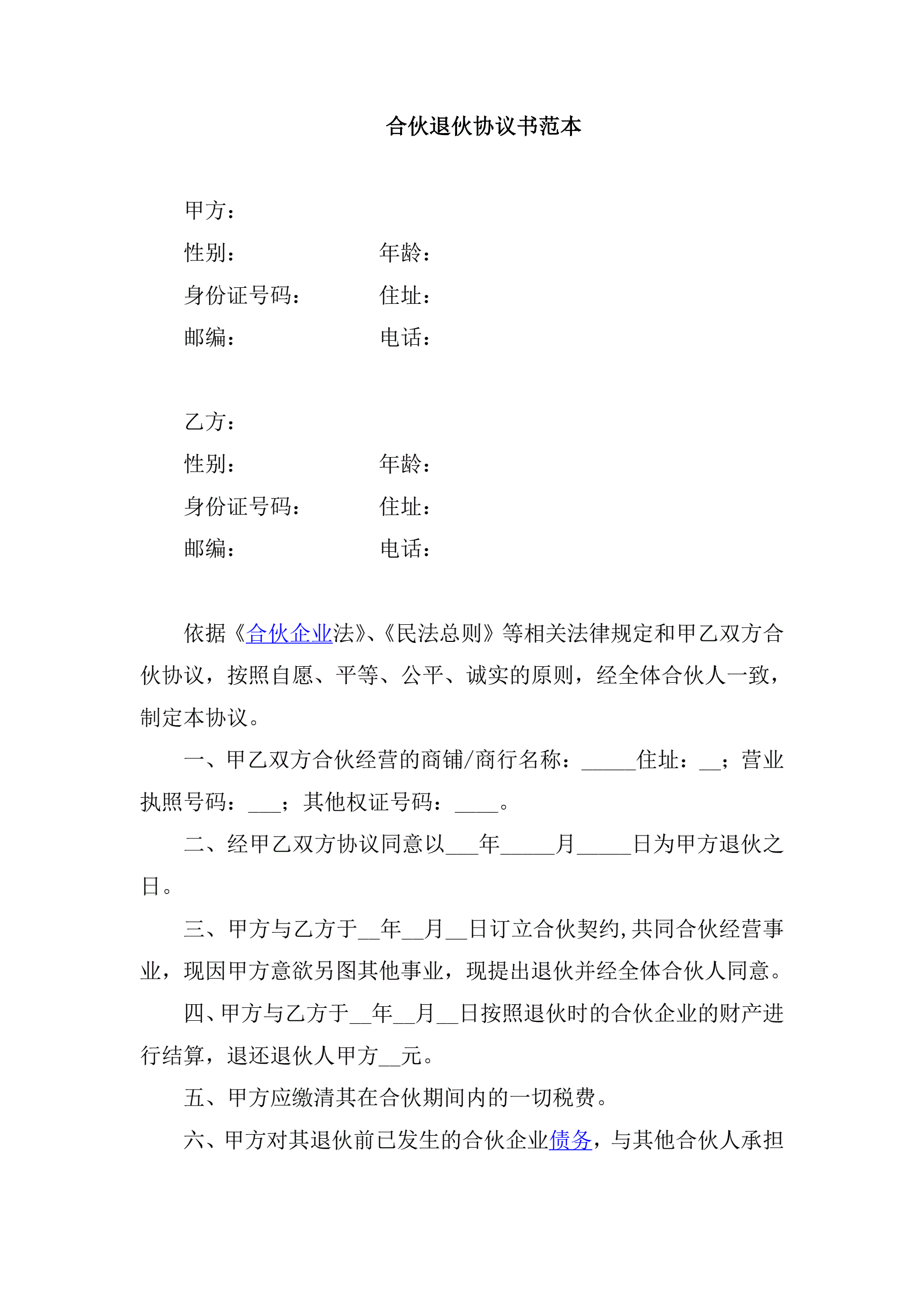 >合伙退伙协议书范本