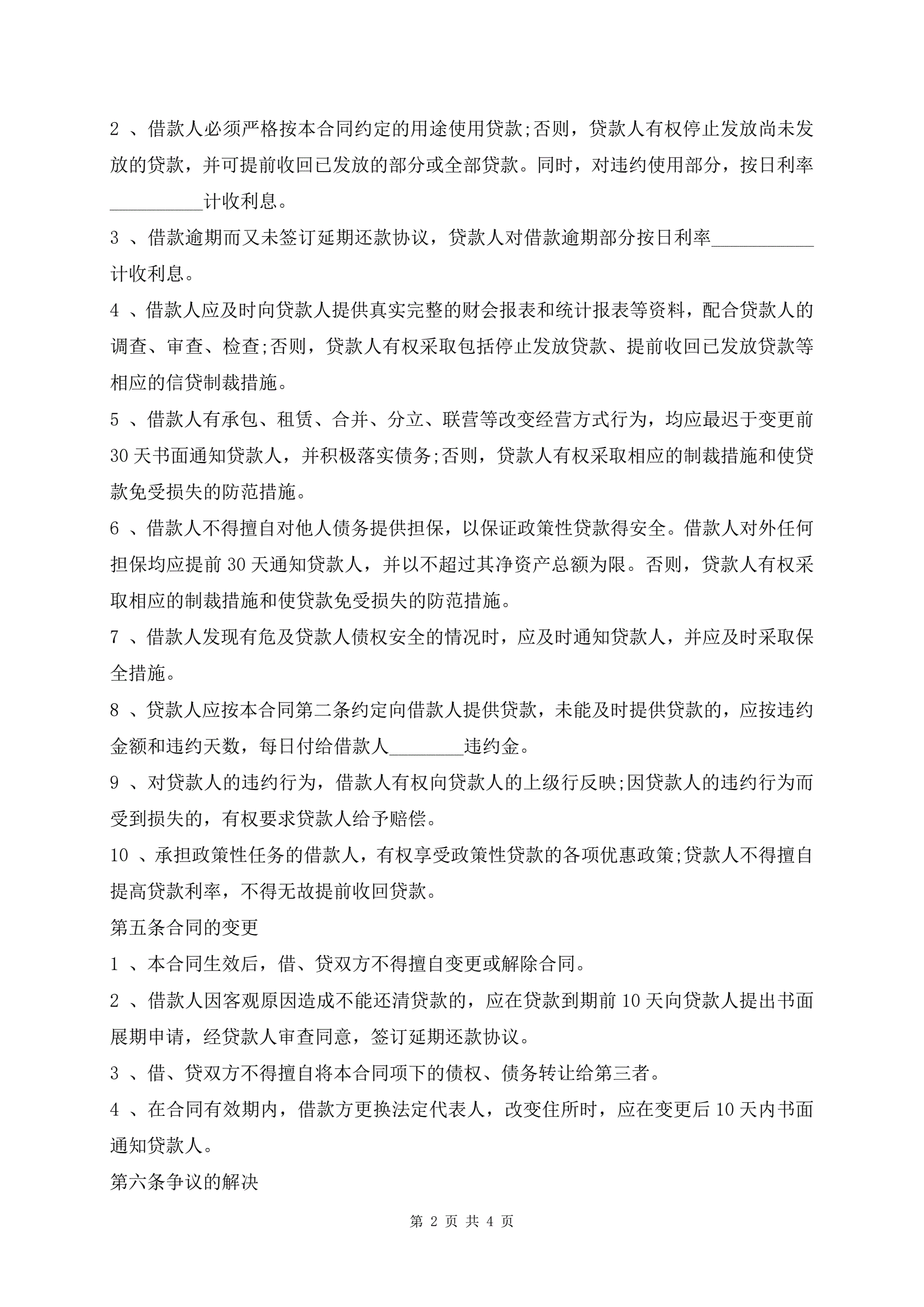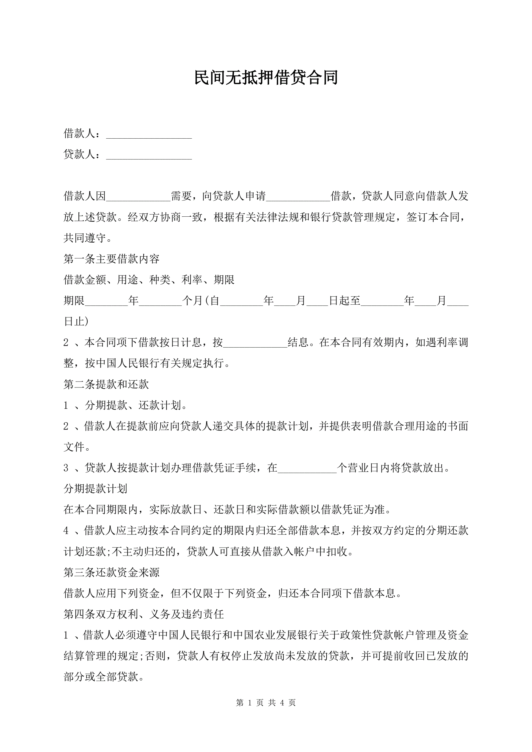 民间无抵押借贷合同