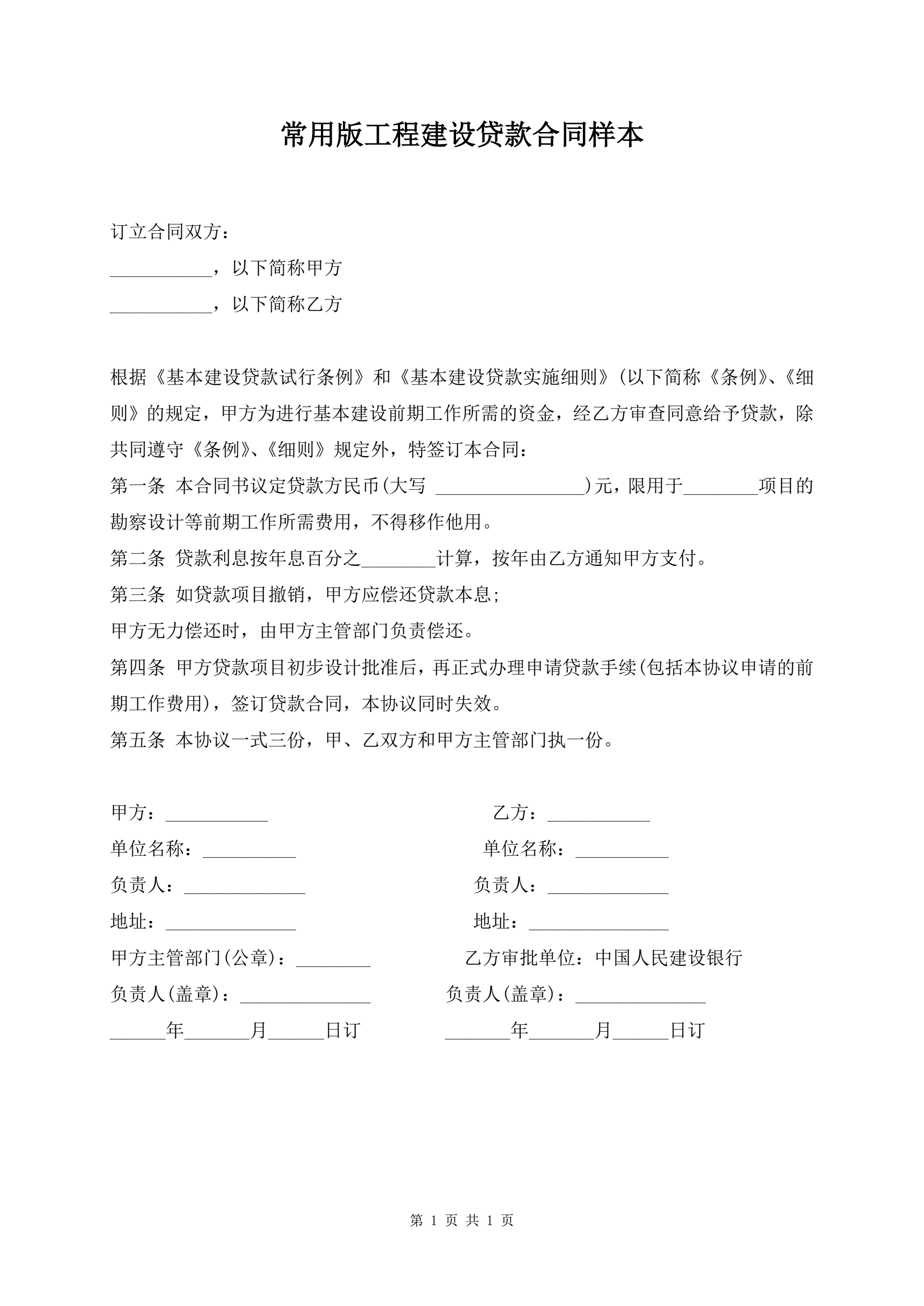 >常用版工程建设贷款合同样本