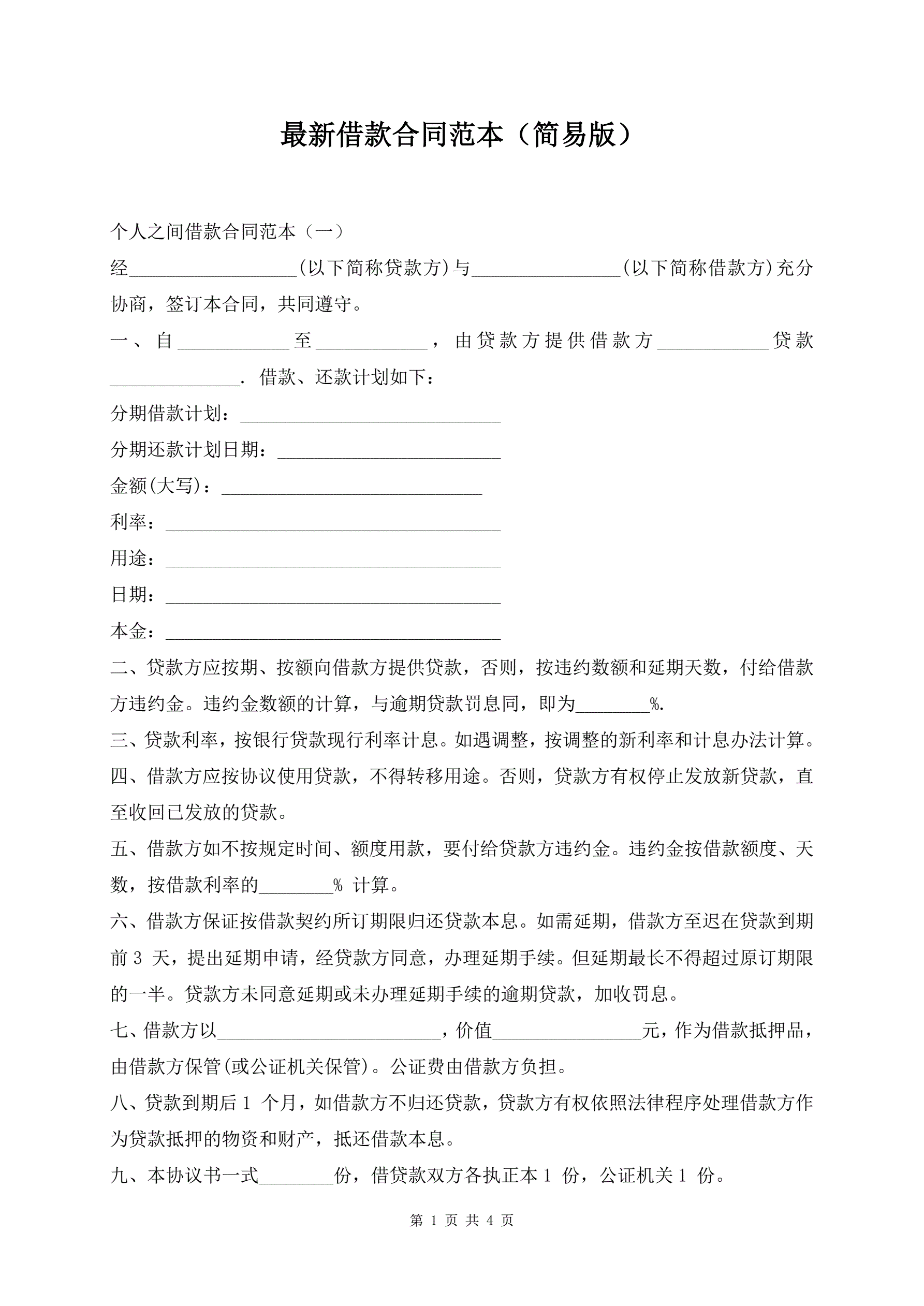 最新借款合同范本(简易版)