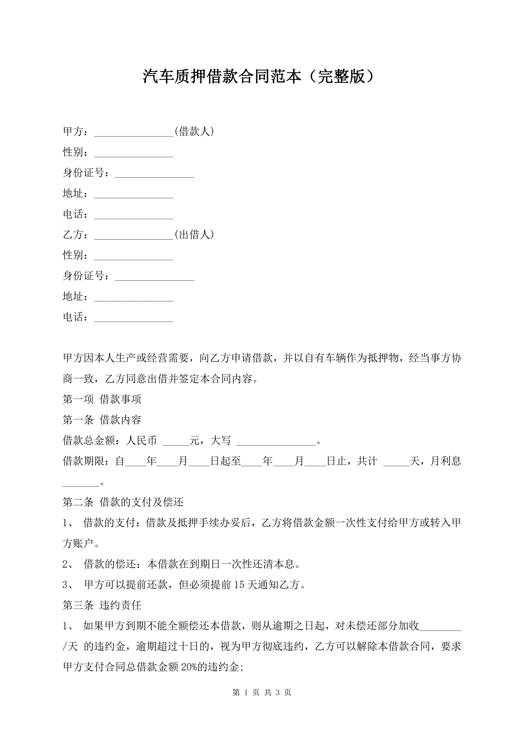 >汽车质押借款合同范本(完整版)
