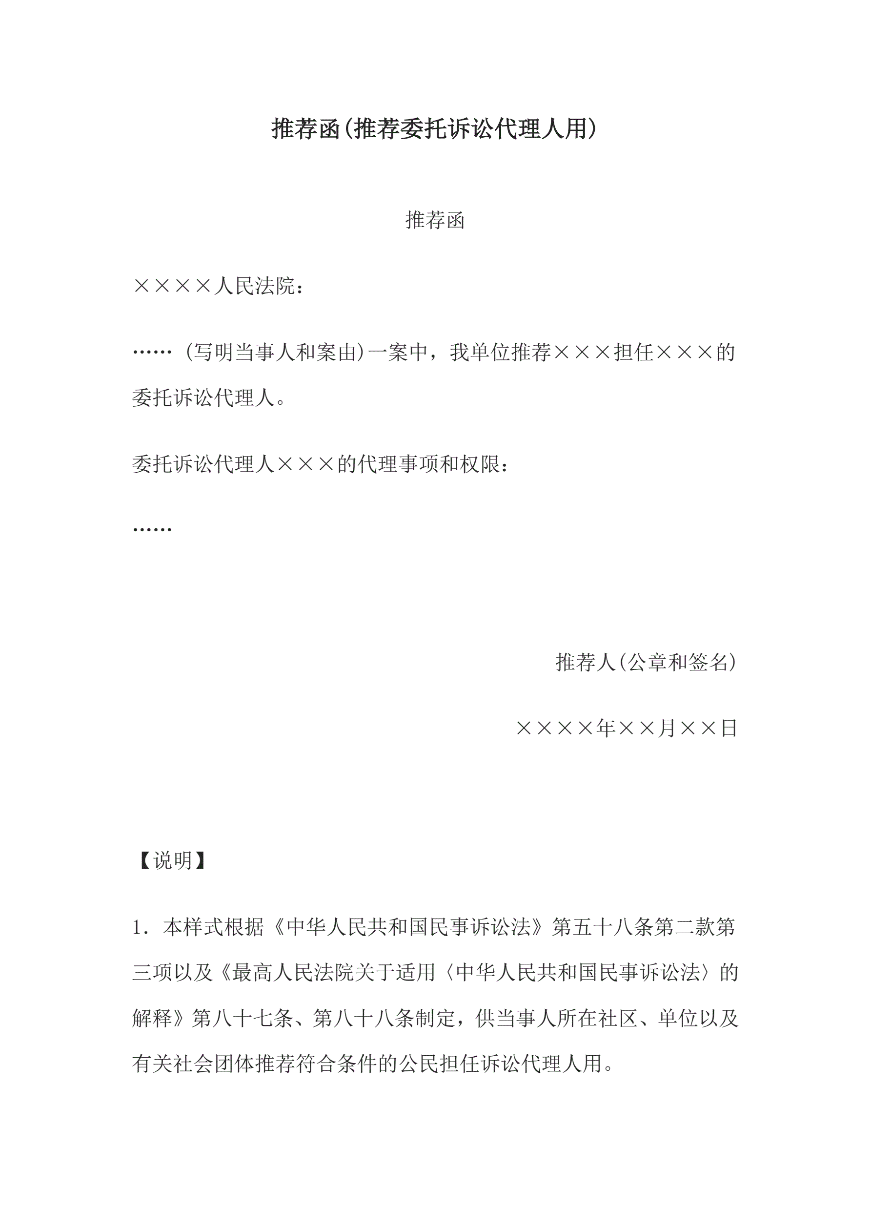 >推荐函(推荐委托诉讼代理人用)
