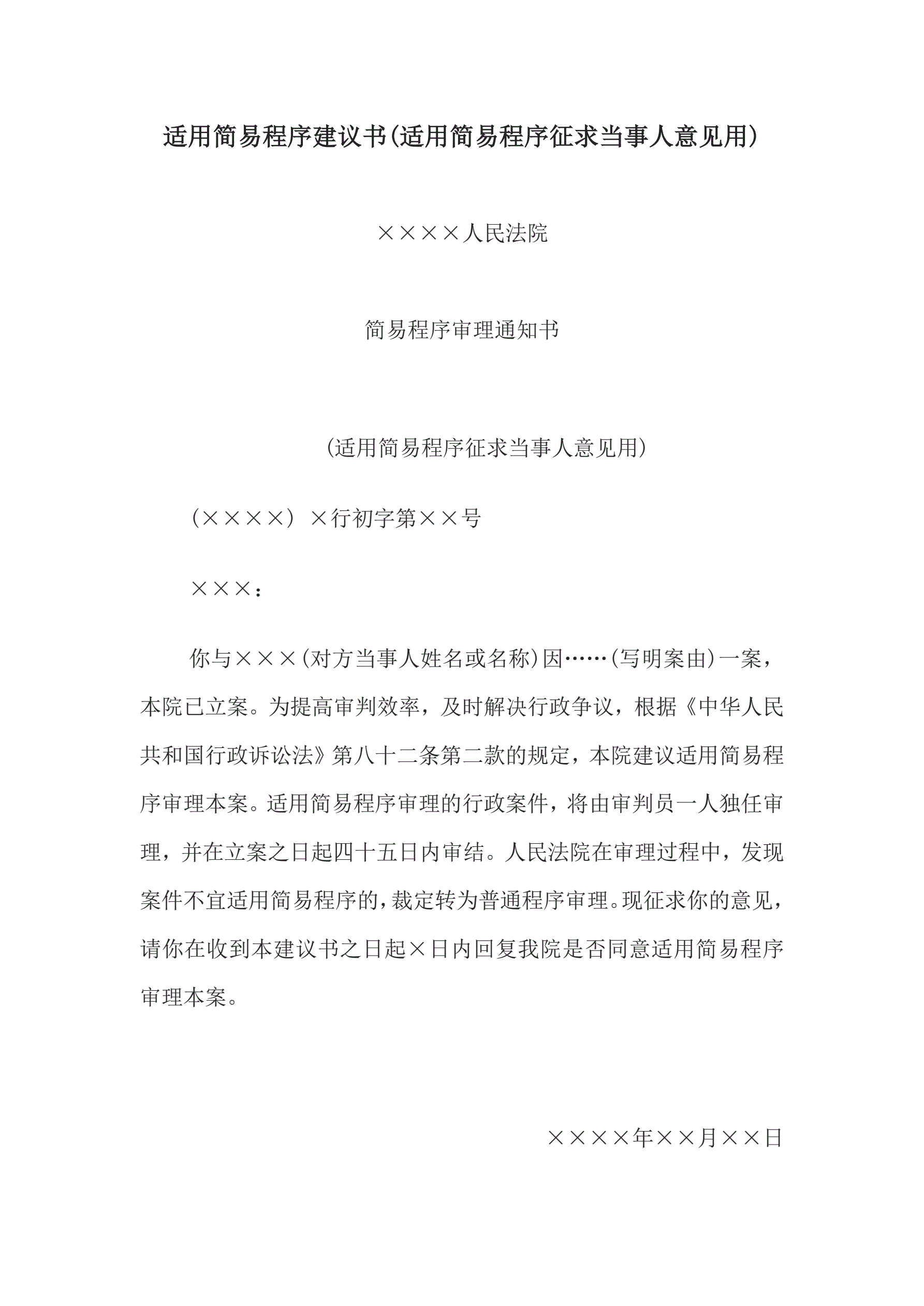 适用简易程序建议书(适用简易程序征求当事人意见用)