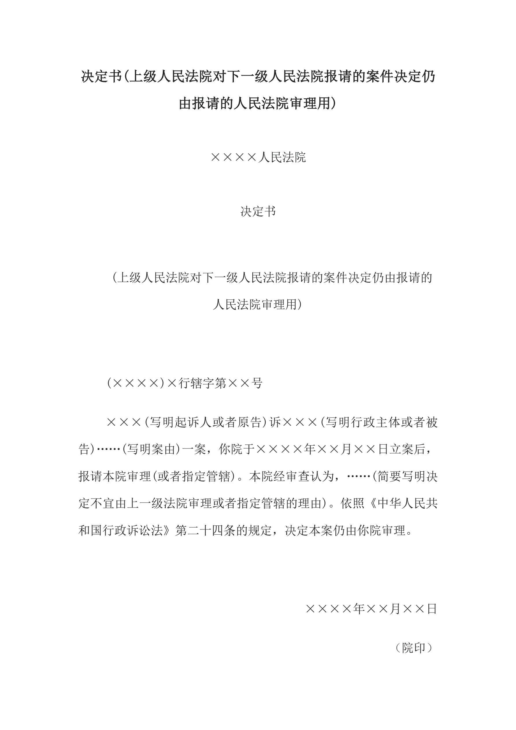 合同名称:决定书(上级人民法院对下一级请的案件决定仍由报请的人民法院审理用)