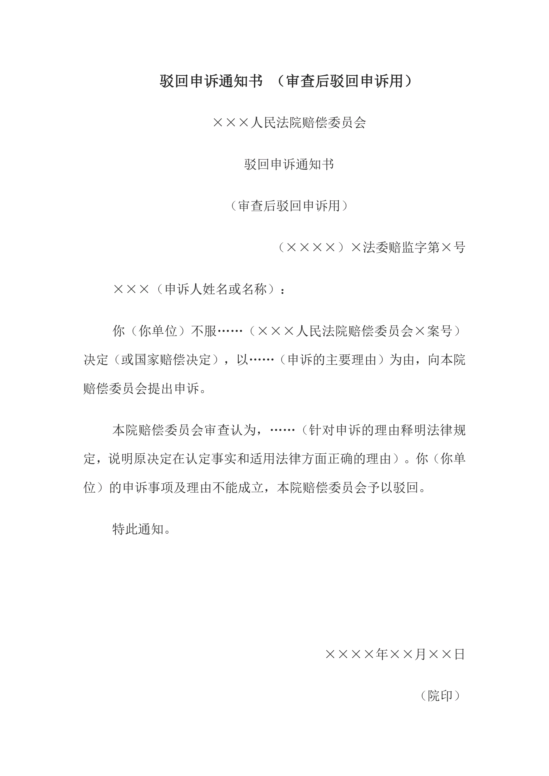 >驳回申诉通知书(审查后驳回申诉用)