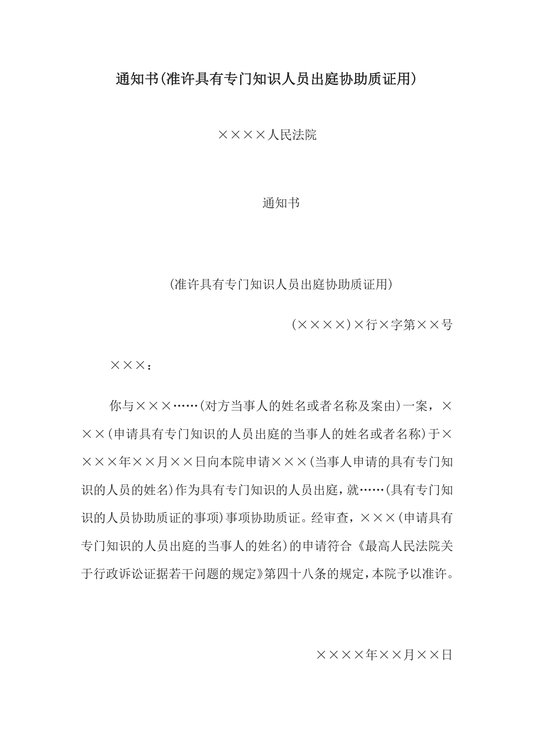 >通知书(准许具有专门知识人员出庭协助质证用)