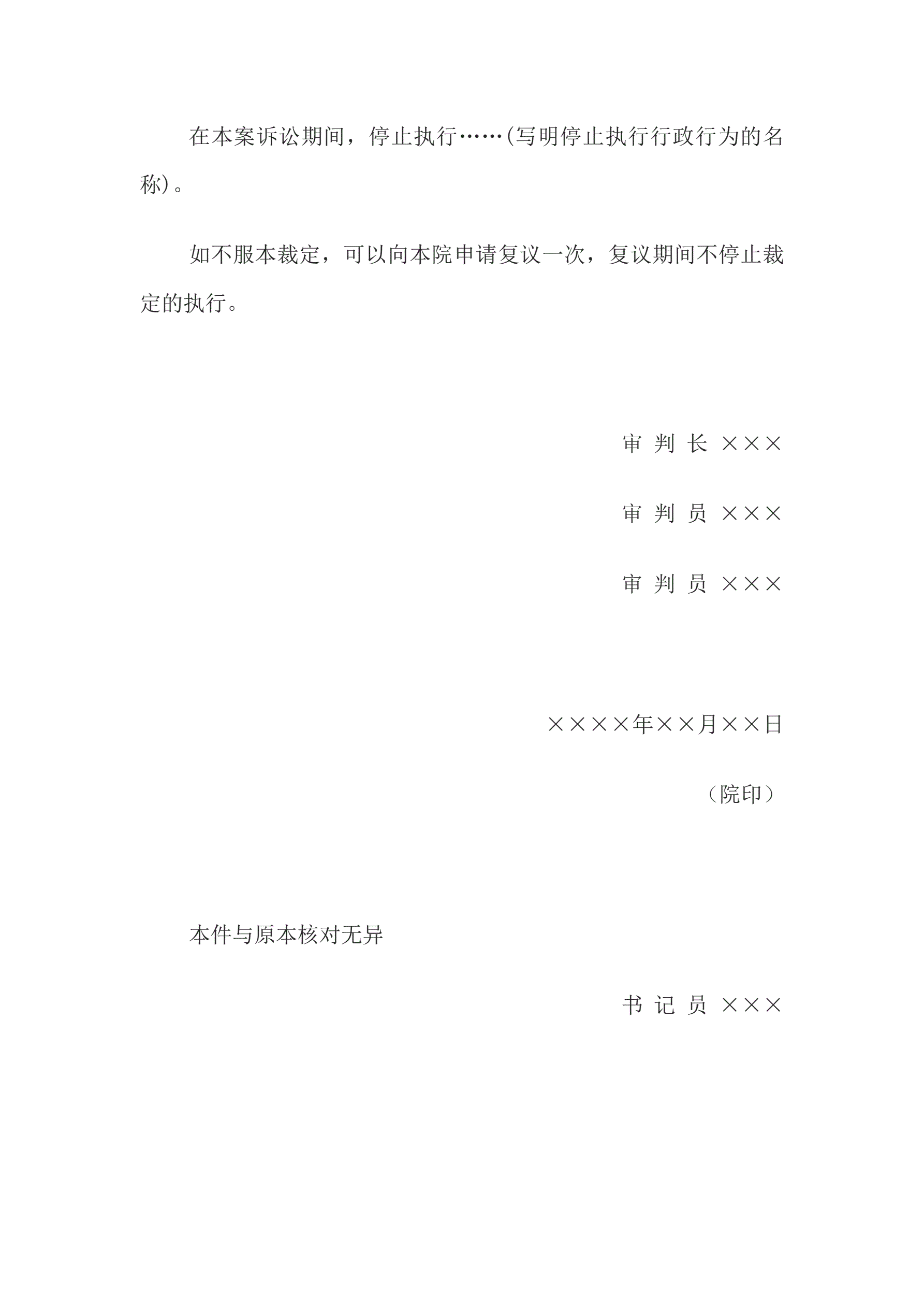 合同名称:行政裁定书(依职权停止执行行政行为用)