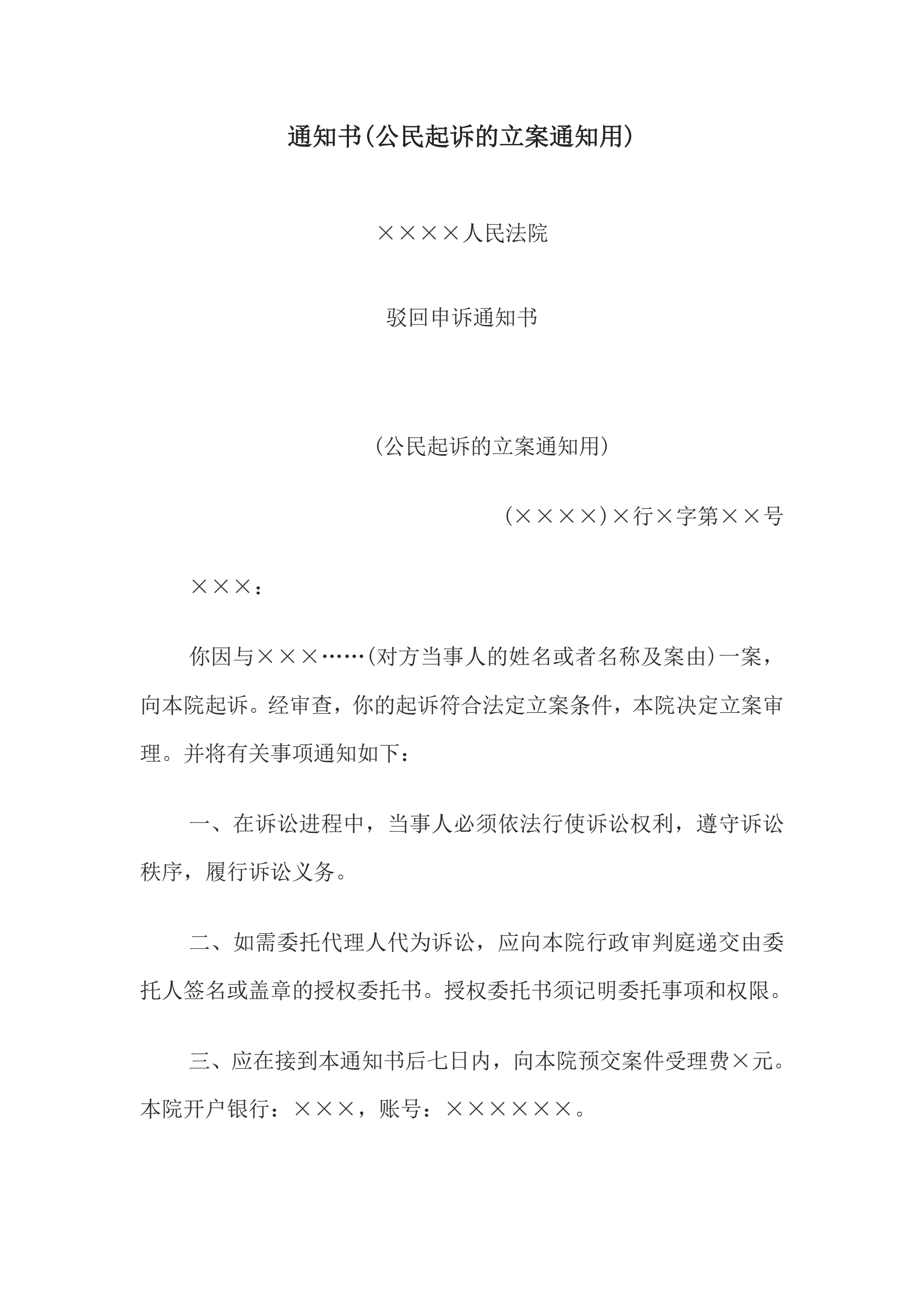 合同名称:通知书(公民起诉的立案通知用)