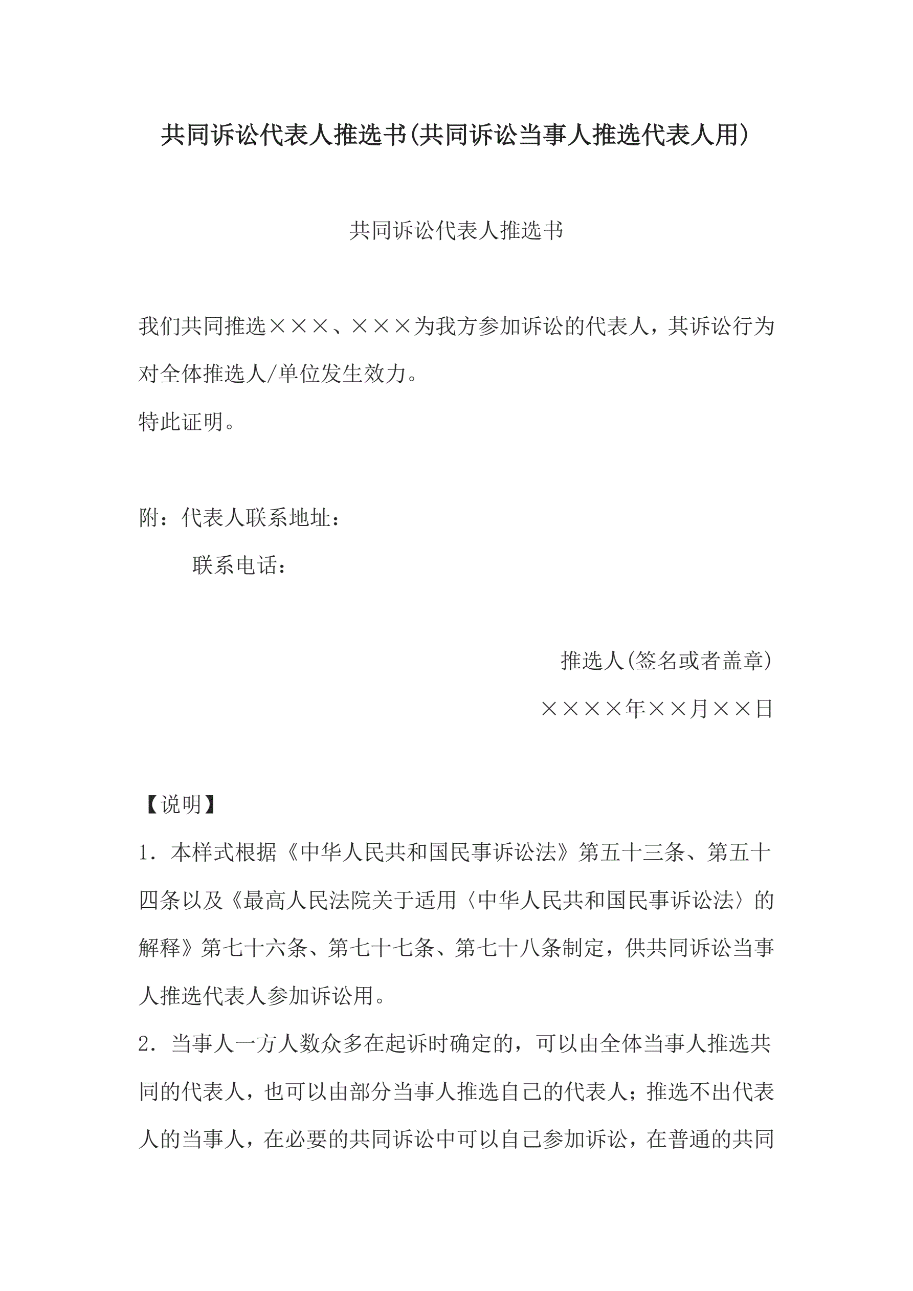 >共同诉讼代表人推选书(共同诉讼当事人推选代表人用)