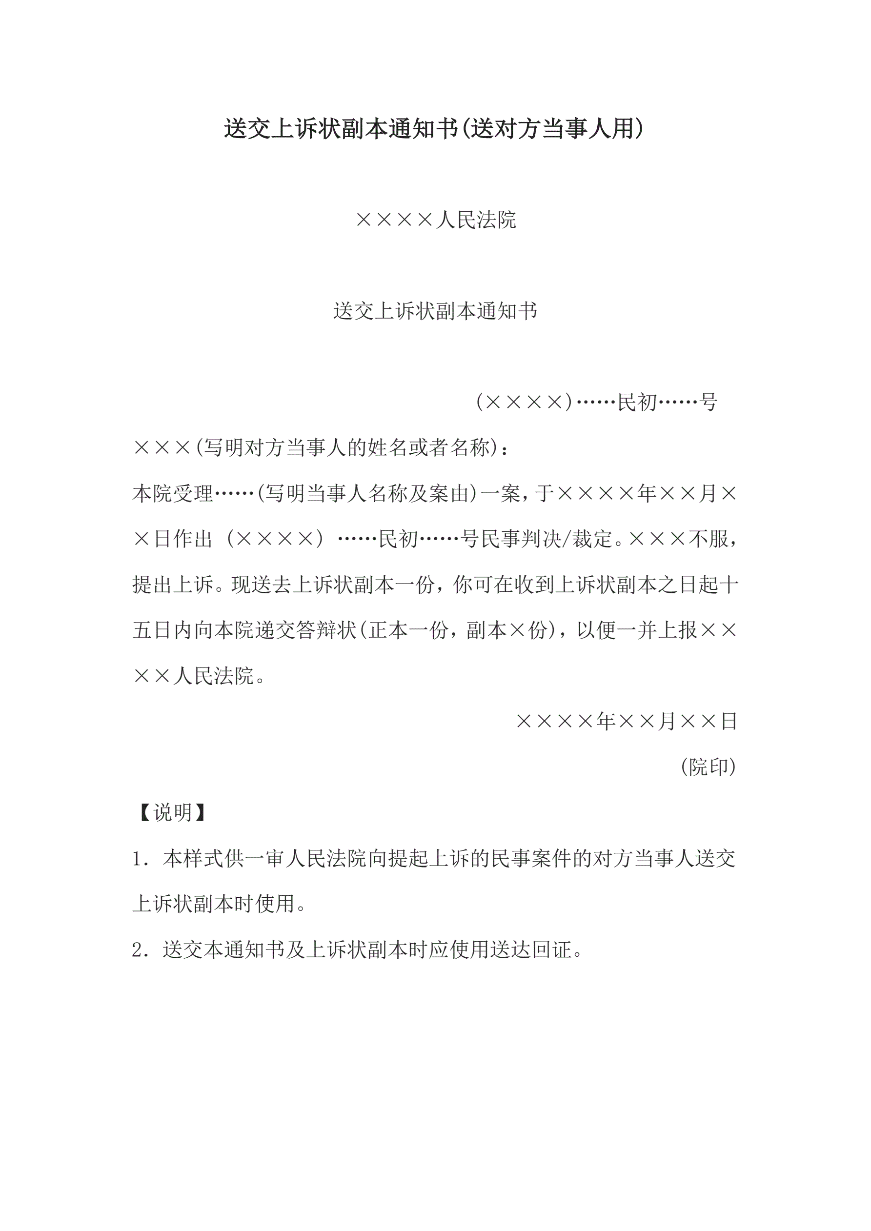 >送交上诉状副本通知书(送对方当事人用)