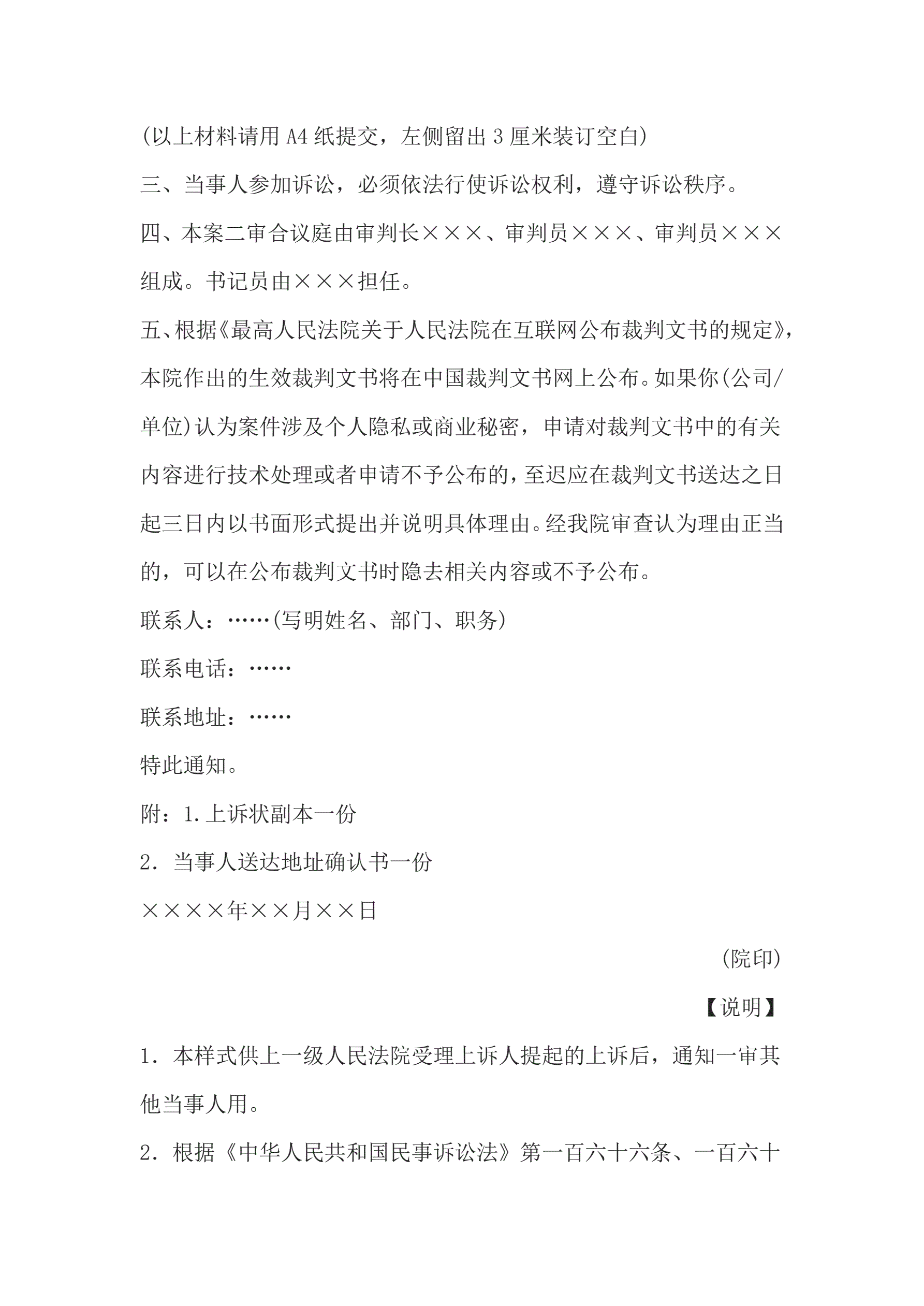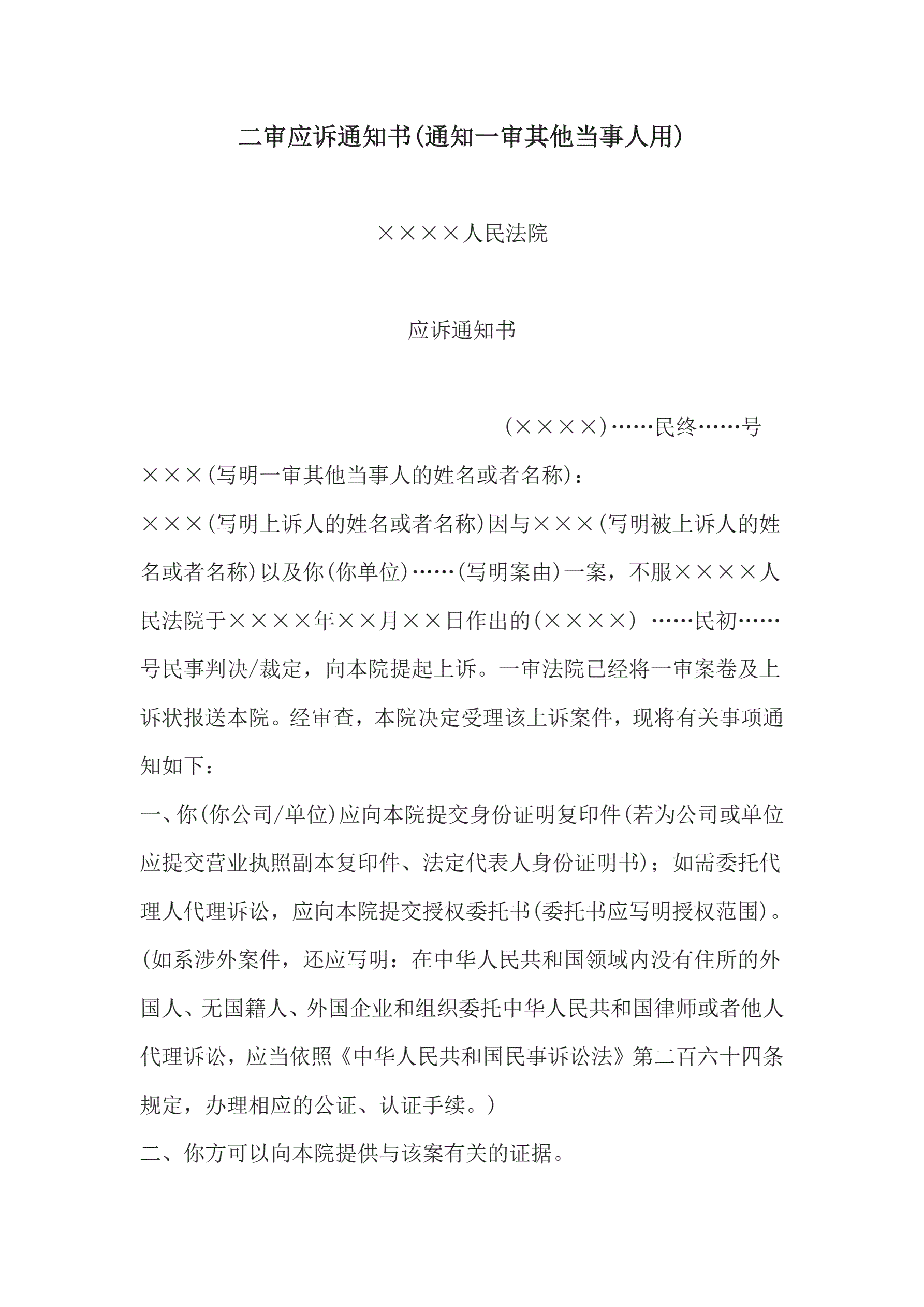 >二shen应诉通知书(通知一审其他当事人用)