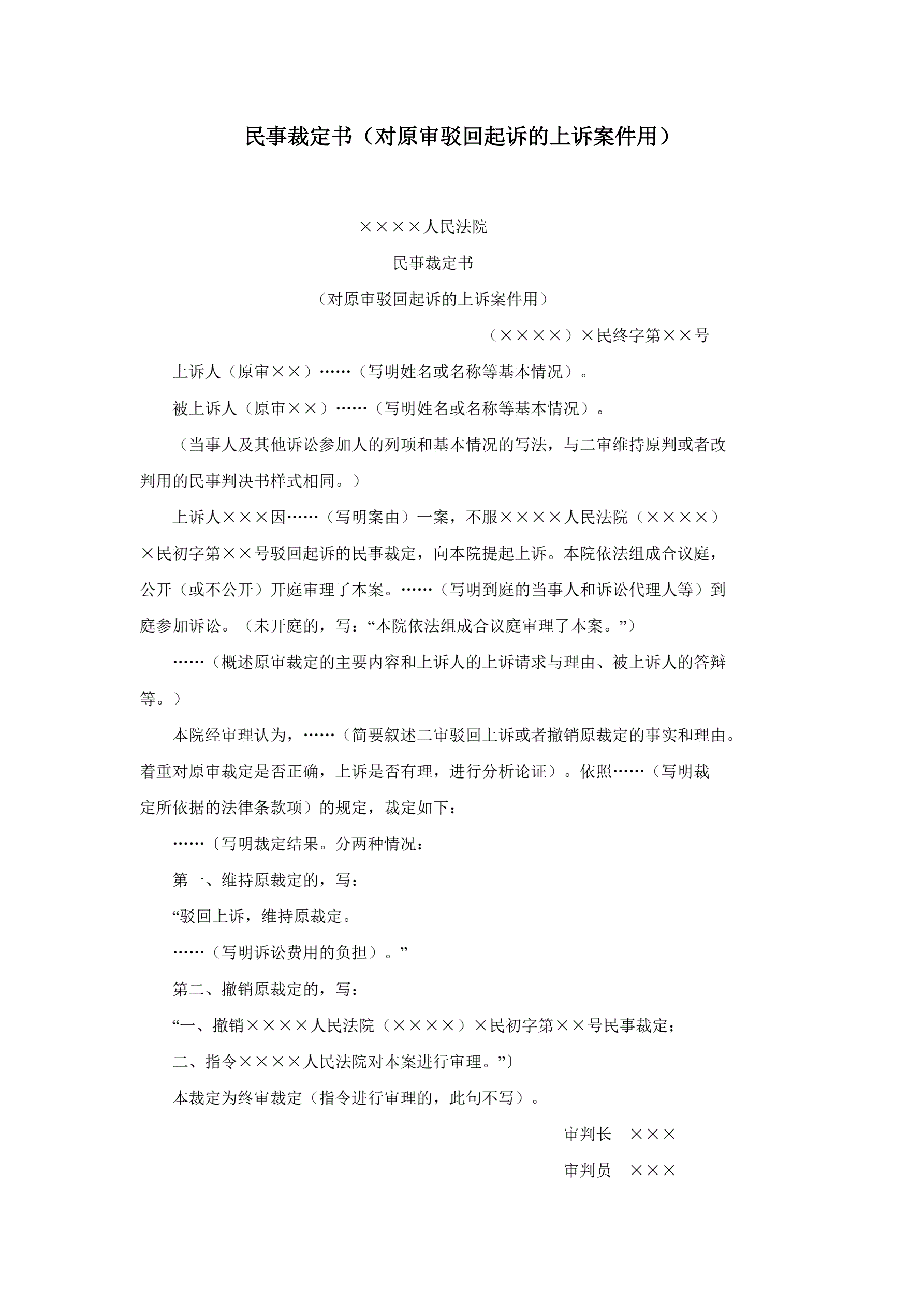 民事裁定书(对原审驳回起诉的上诉案件用)