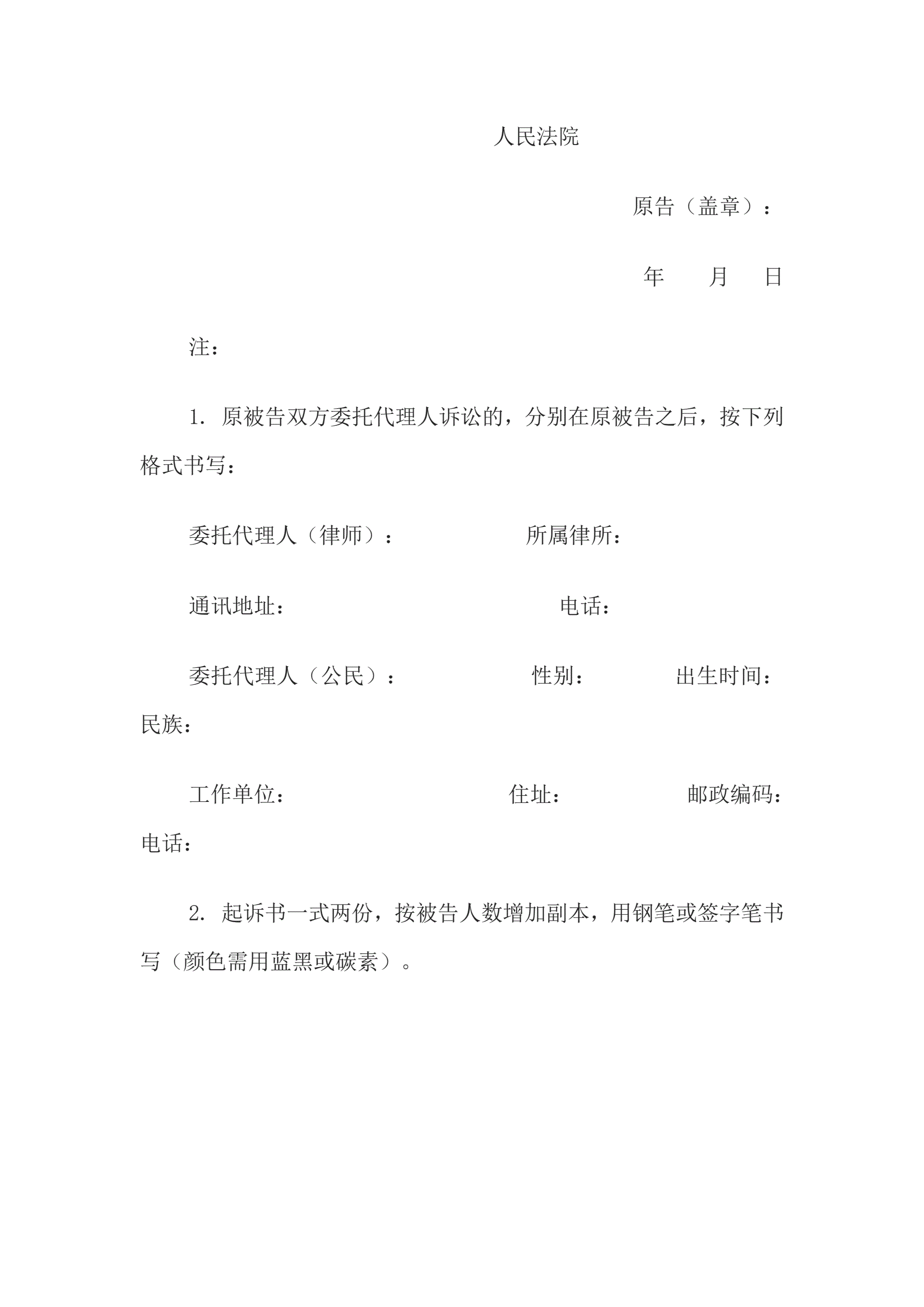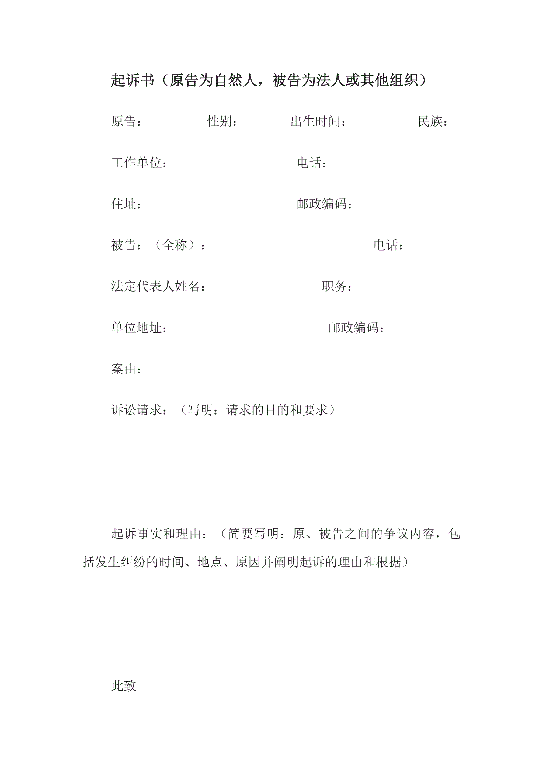 >起诉书(原告为自然人,被告为法人或其他组织)