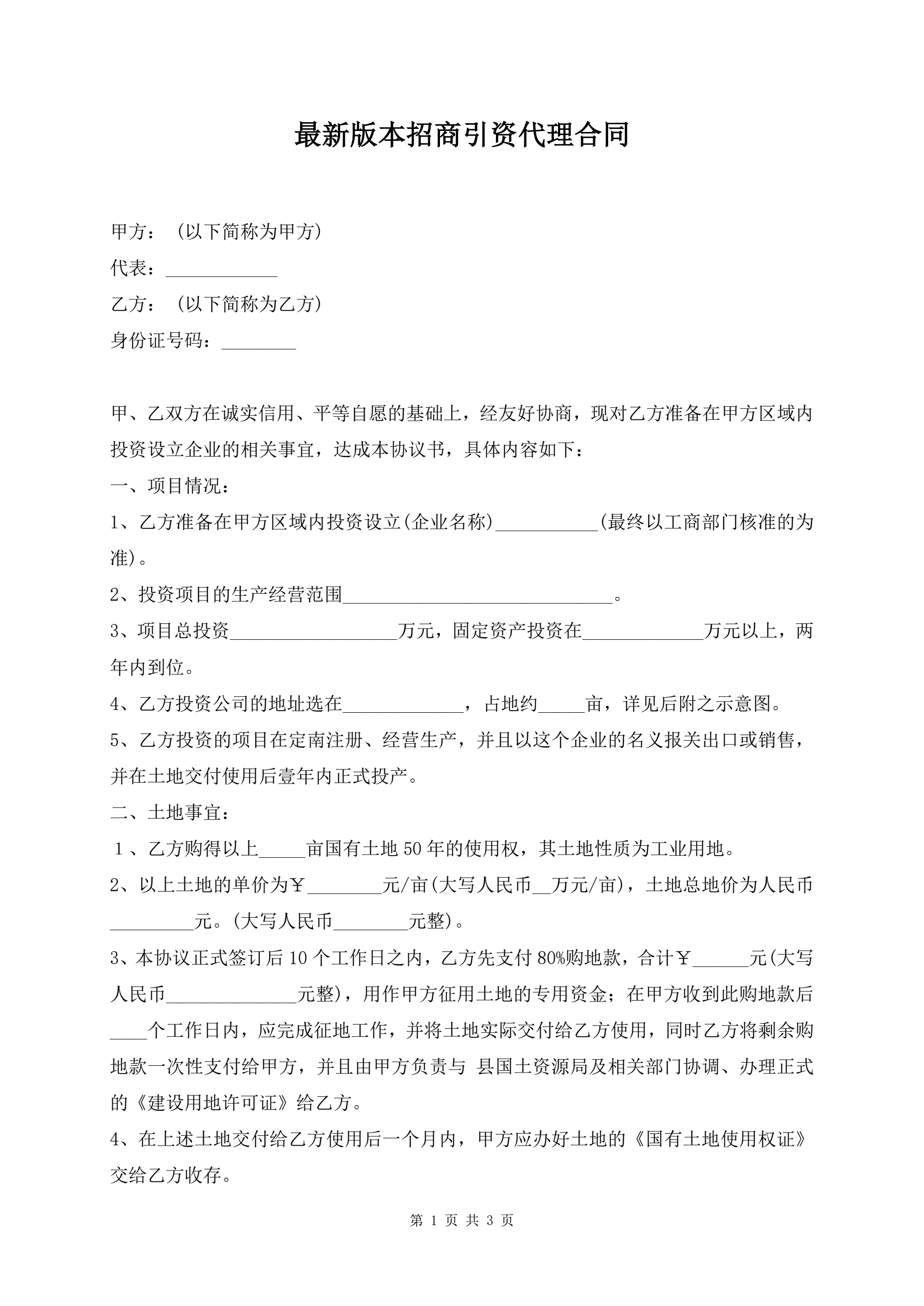 最新版本招商引资代理合同