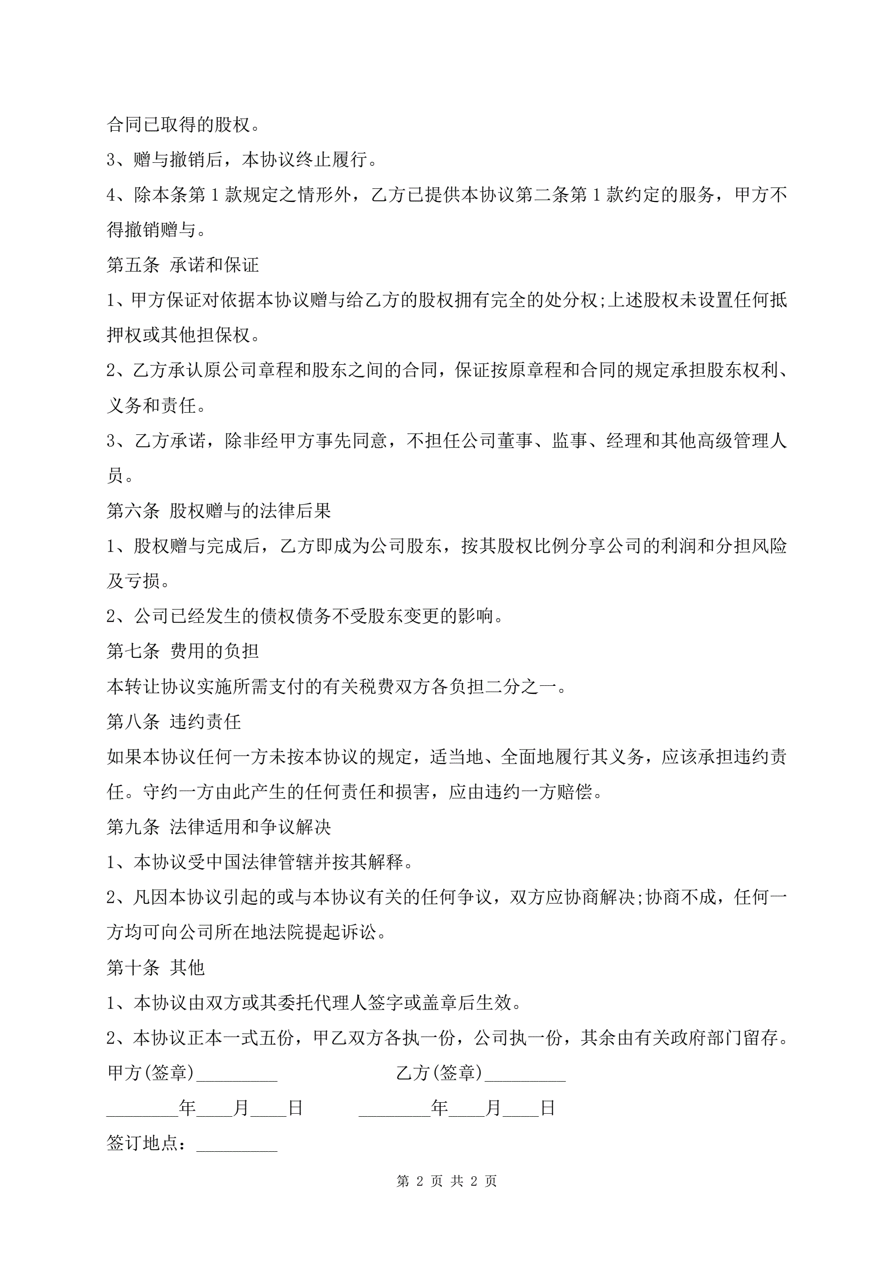 专业版亲属间股份赠与合同