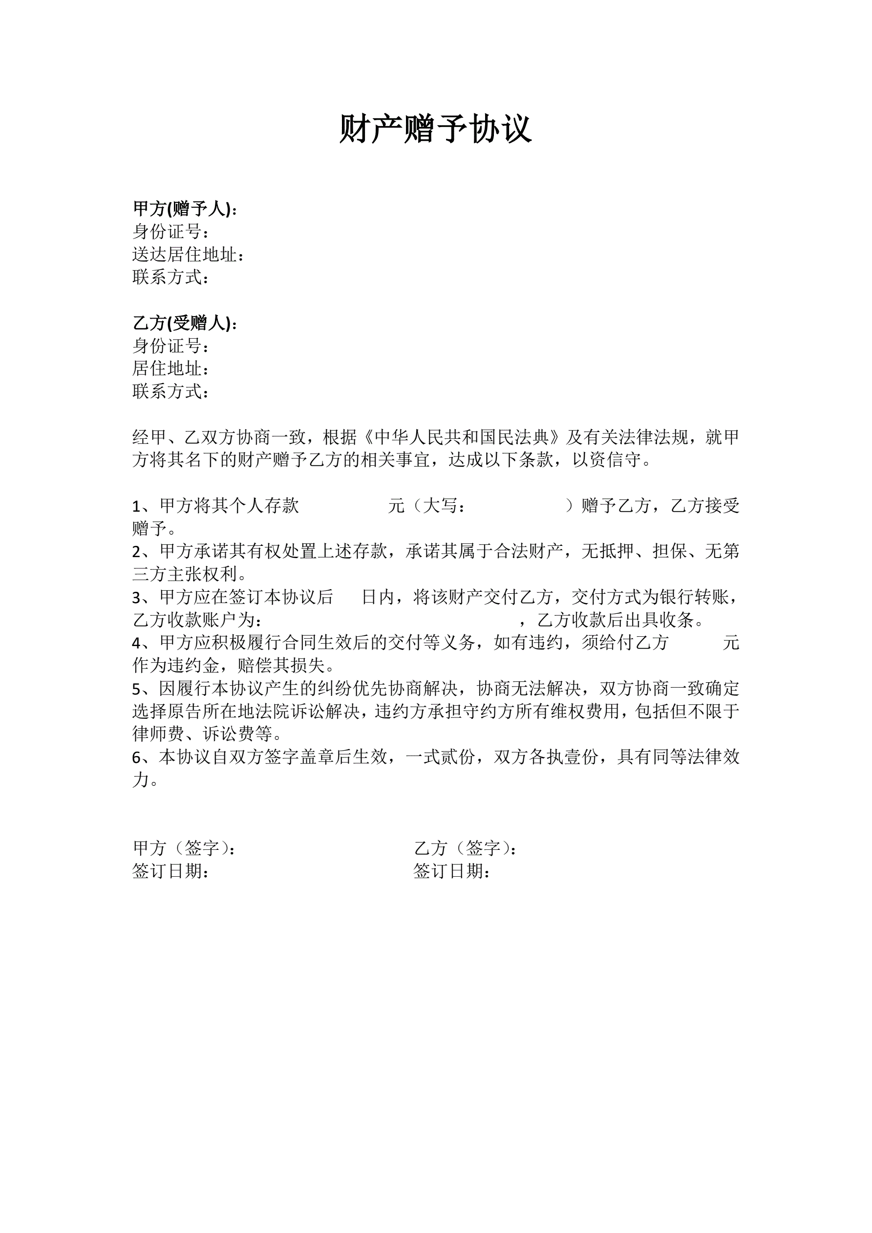 财产赠与协议(指导版)