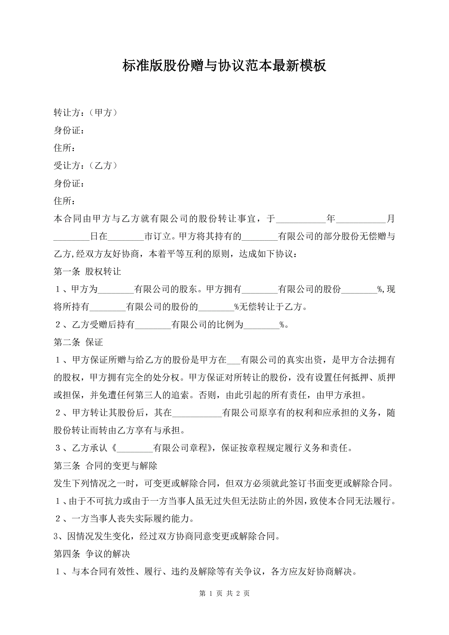 标准版股份赠与协议范本最新模板