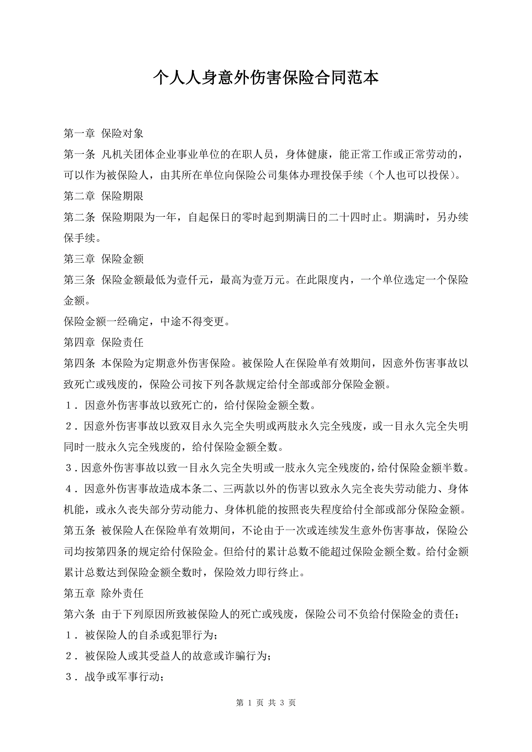 个人人身意外伤害保险合同范本