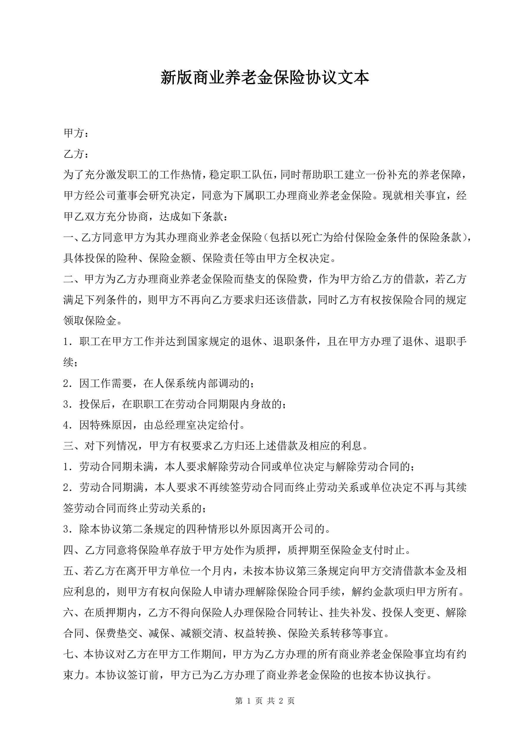 >新版商业养老金保险协议文本