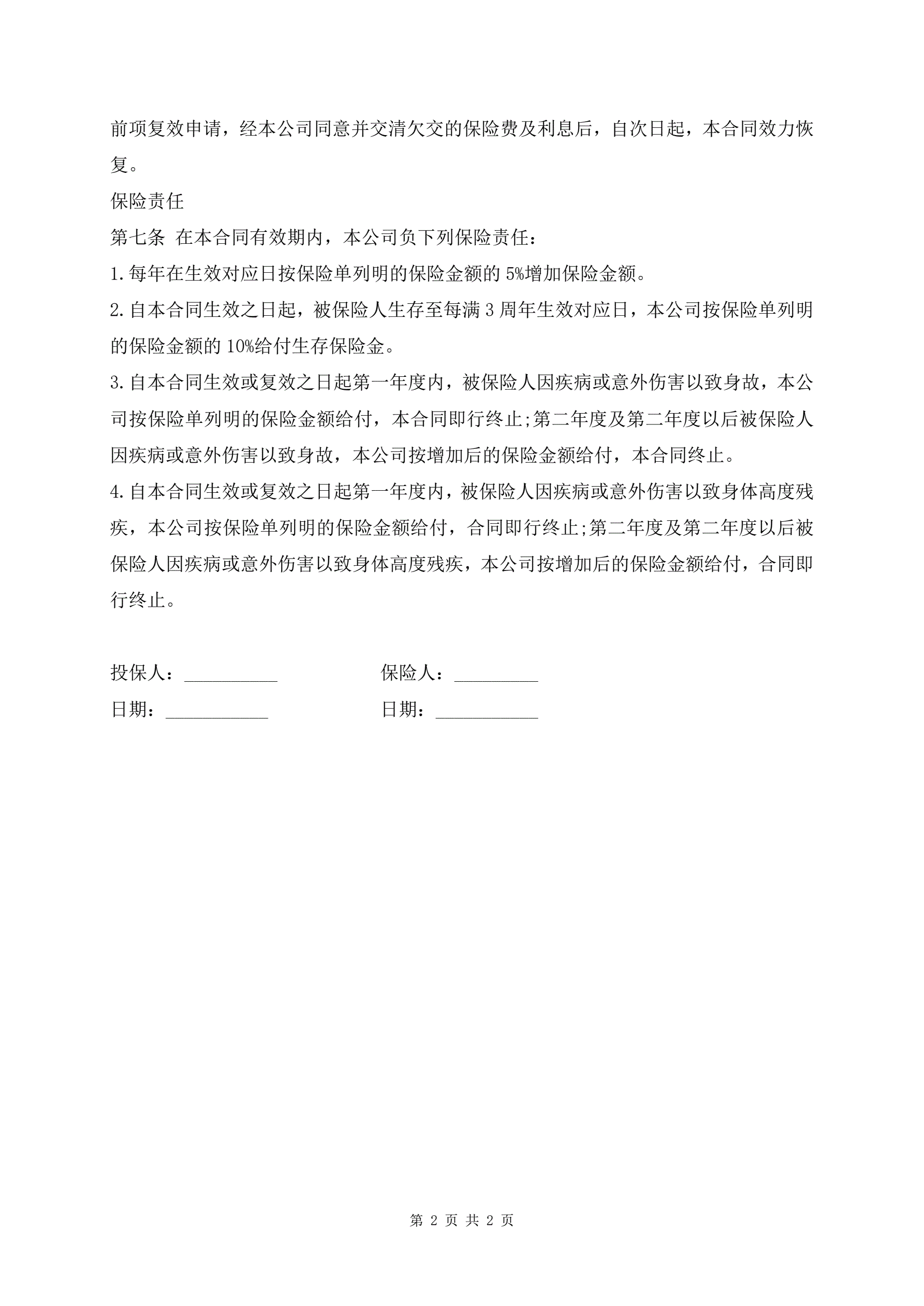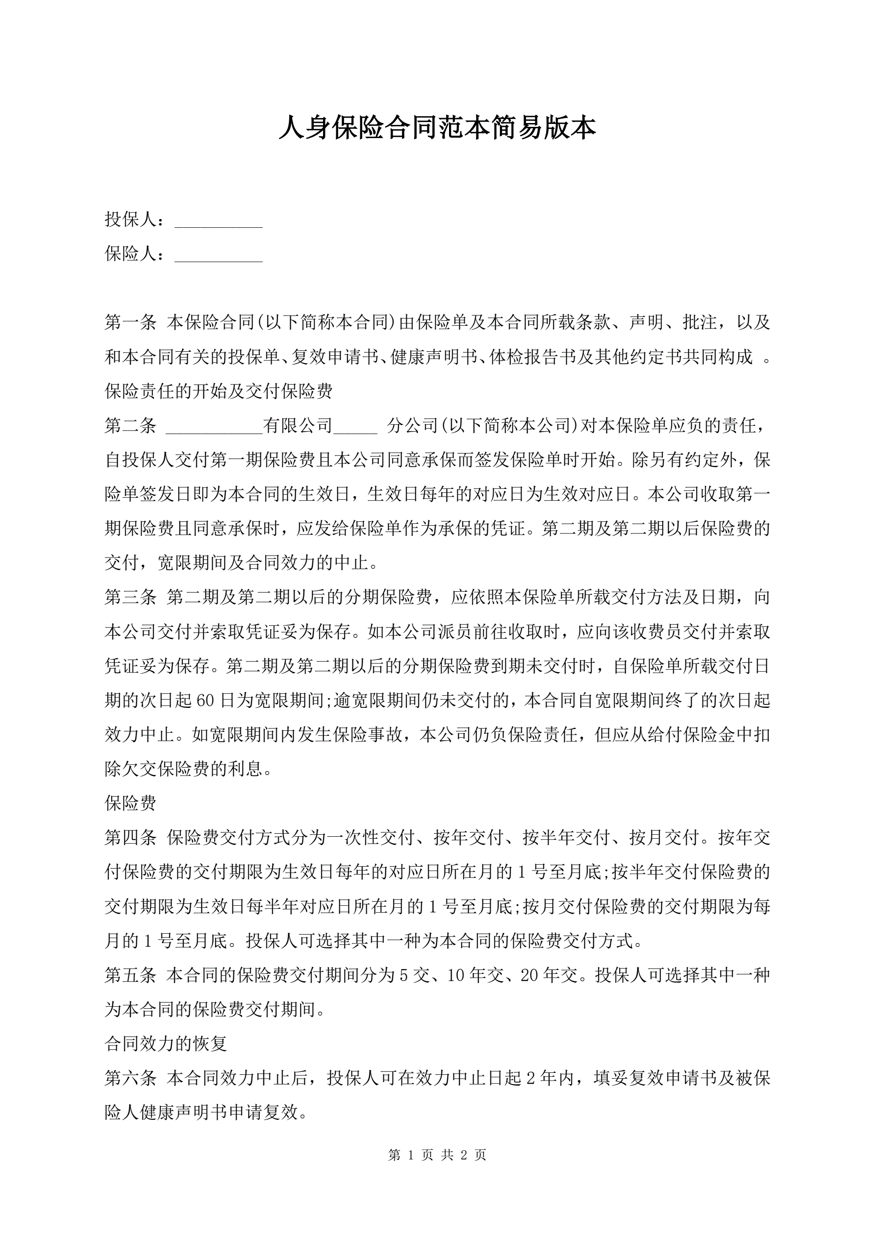 人身保险合同范本简易版本