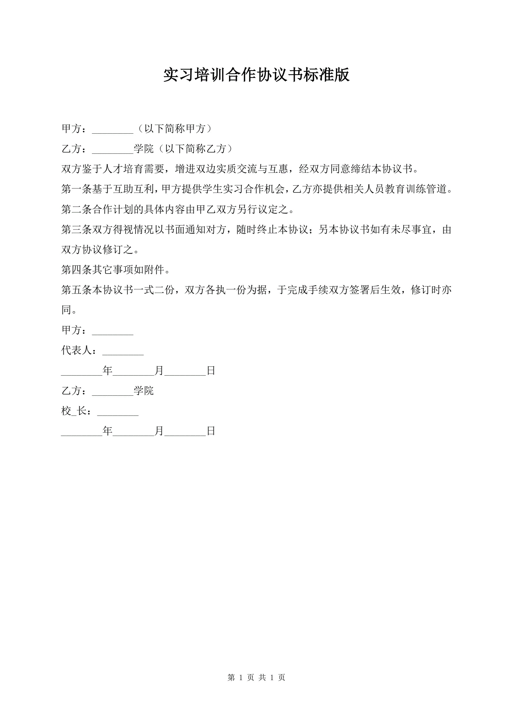 实习培训合作协议书标准版