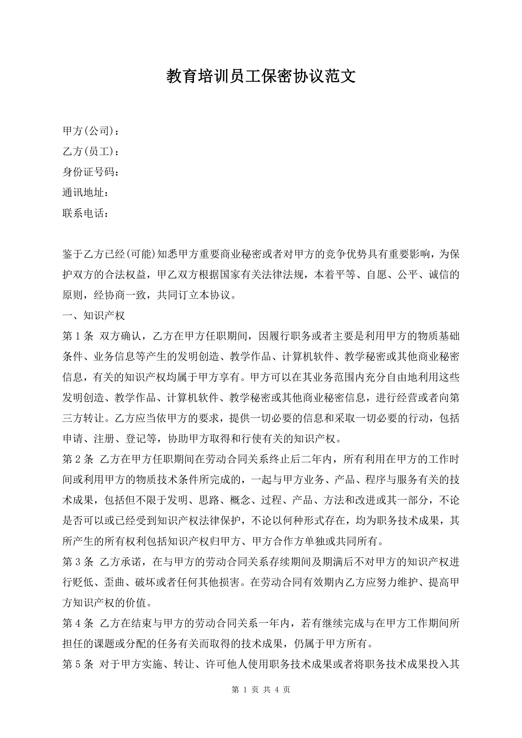 >教育培训员工保密协议范文