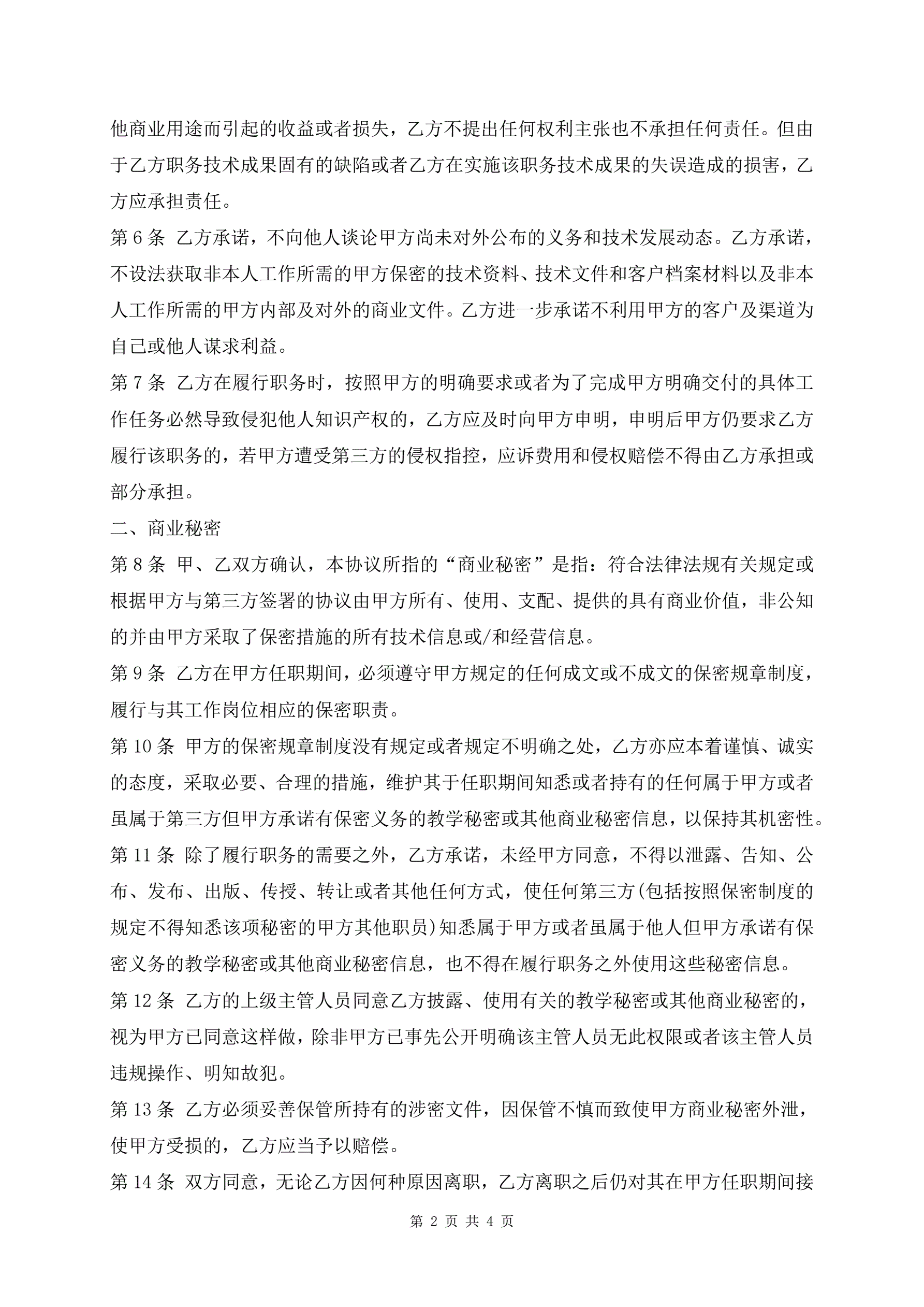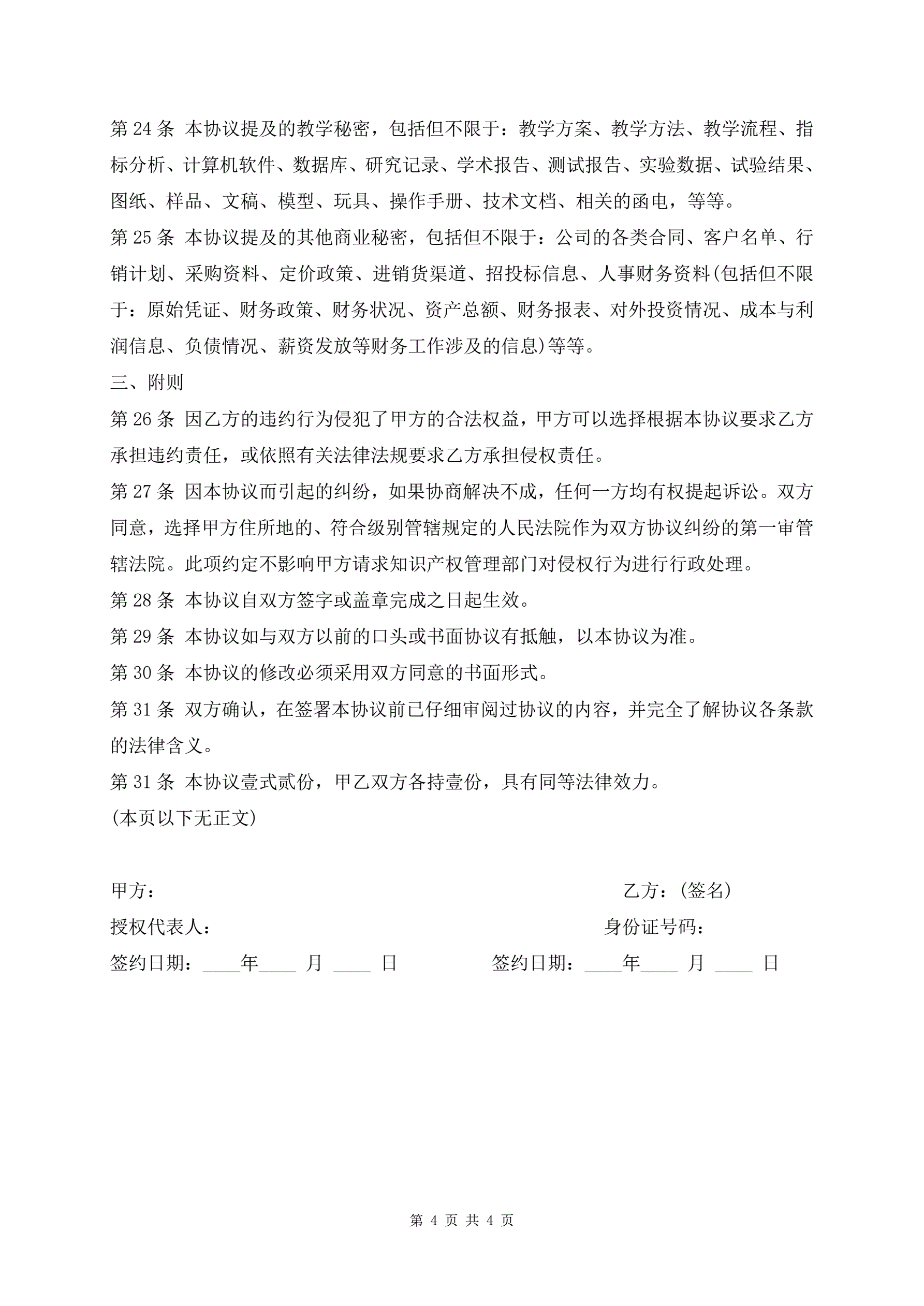 教育培训员工保密协议范文