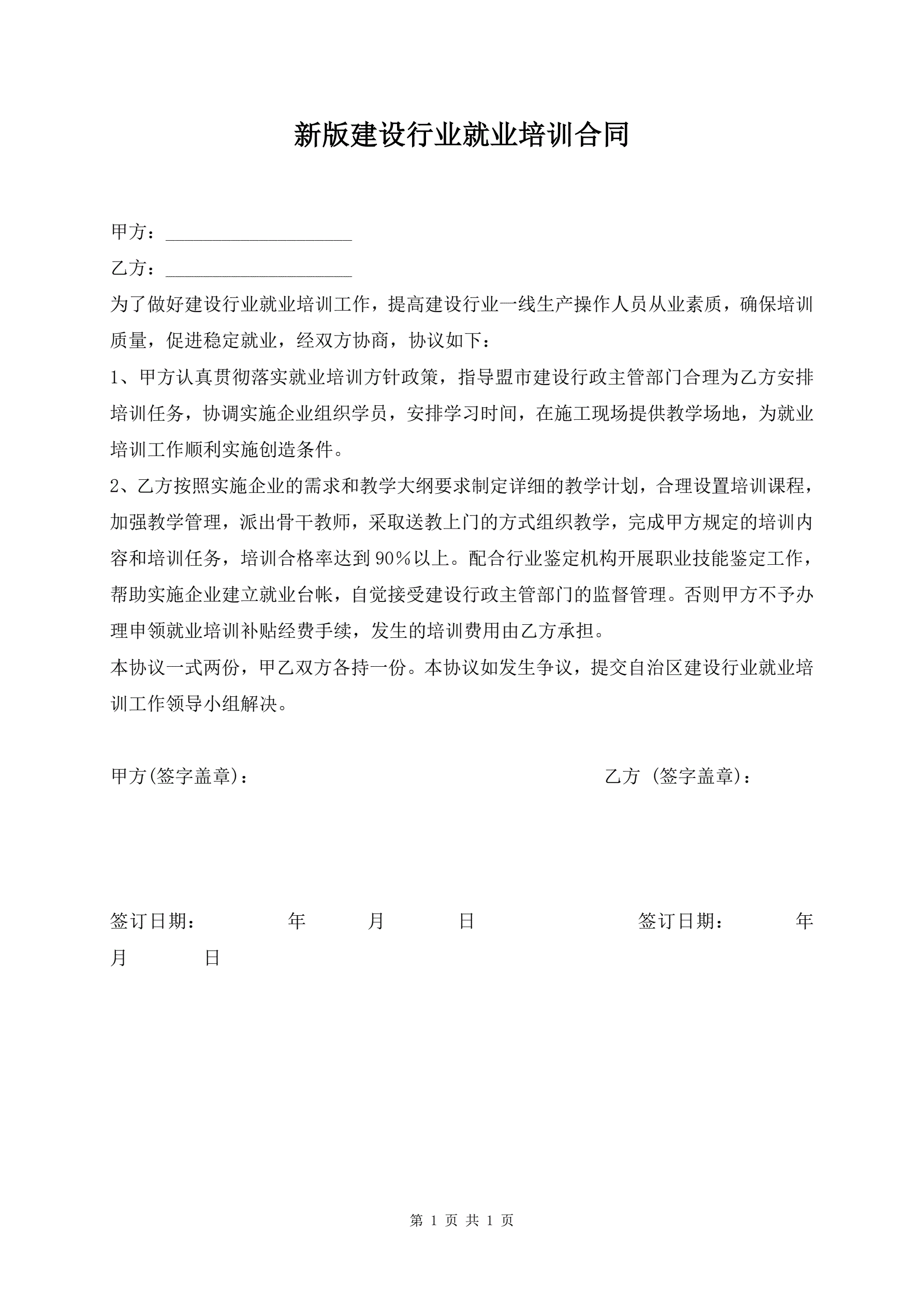 >新版建设行业就业培训合同